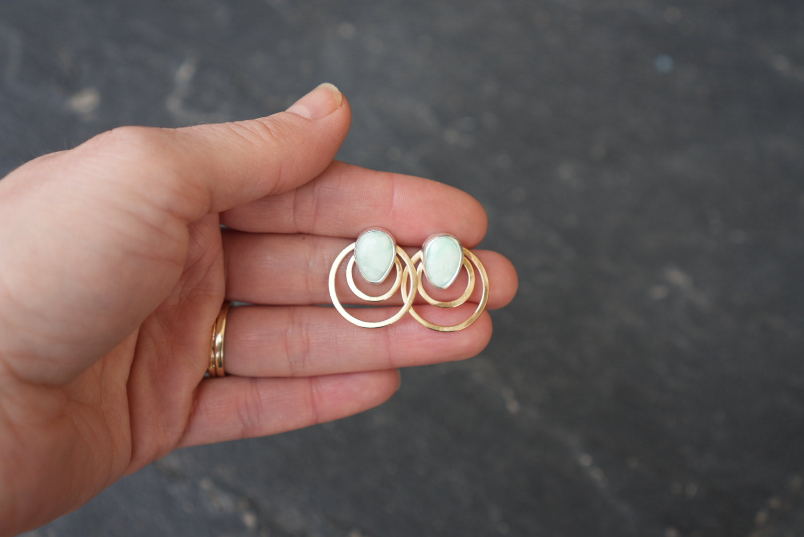 These earrings are a two in one. Simple post earrings with incredible watercolor-like milky green Paloma Variscite gemstones.These have accompanying double brass hoops that can be worn together for a statement post, or apart for a simple everyday post earring set. Posts are made of sterling silver with sterling silver earnuts. Hoops are made with jewelers brass. Brass is subject to oxidation and will naturally darken with time. I love how brass looks as it ages, but if it’s not for you, polish on a regular basis to keep them shiny. Hoops measure a little over .75 inches in diameter.