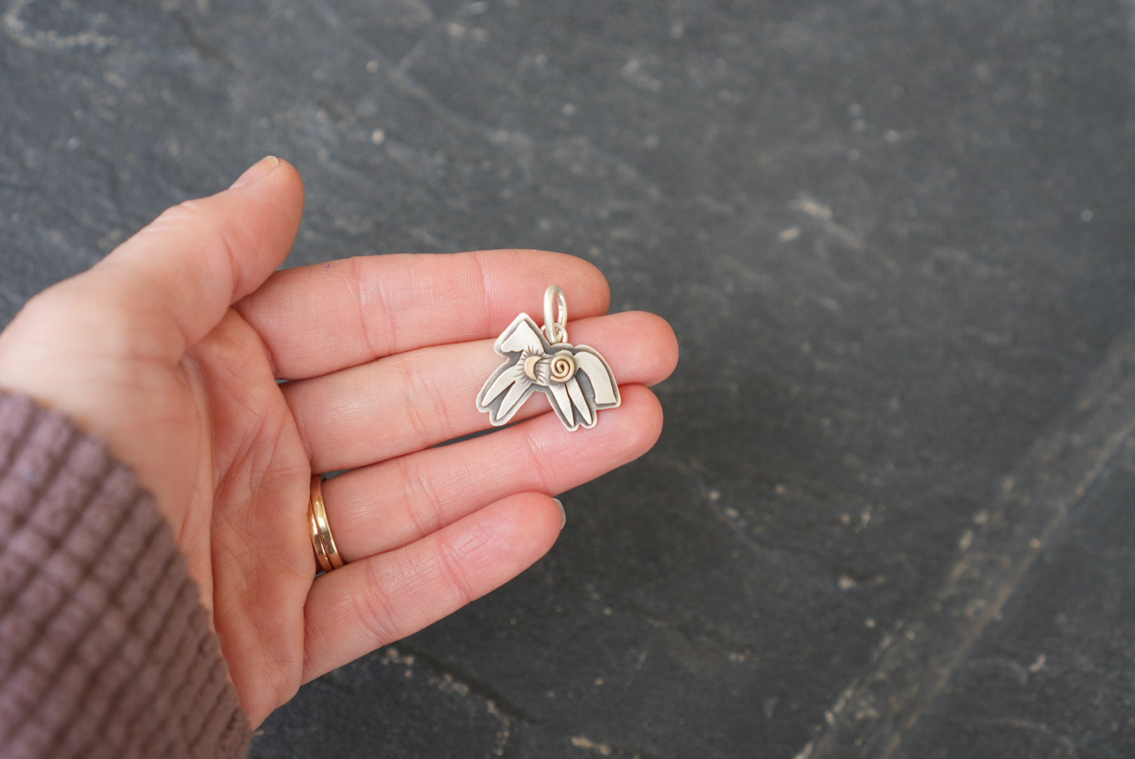 A sweet little horse pendant made with two layers of sterling silver and little layered brass details on the body. finished with a silver bail to string on your choice of chain or bead strand. Pendant measures about 1 inch wide and .5 inches tall.