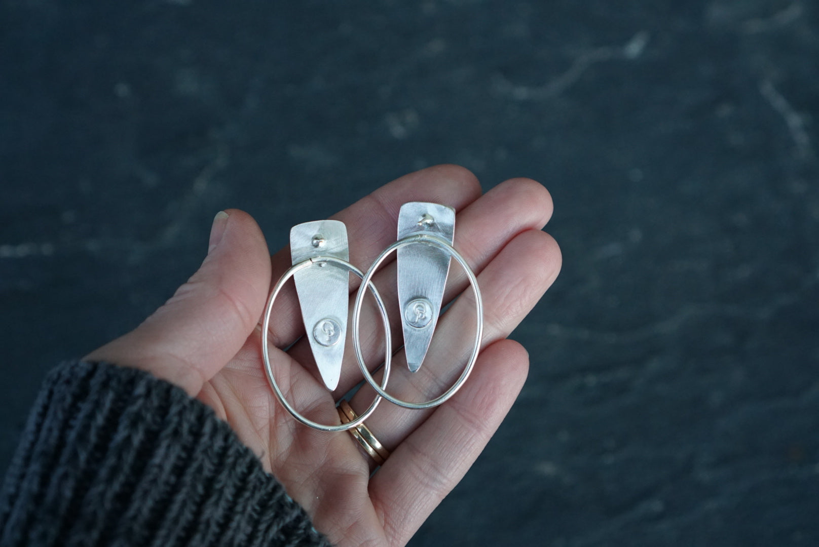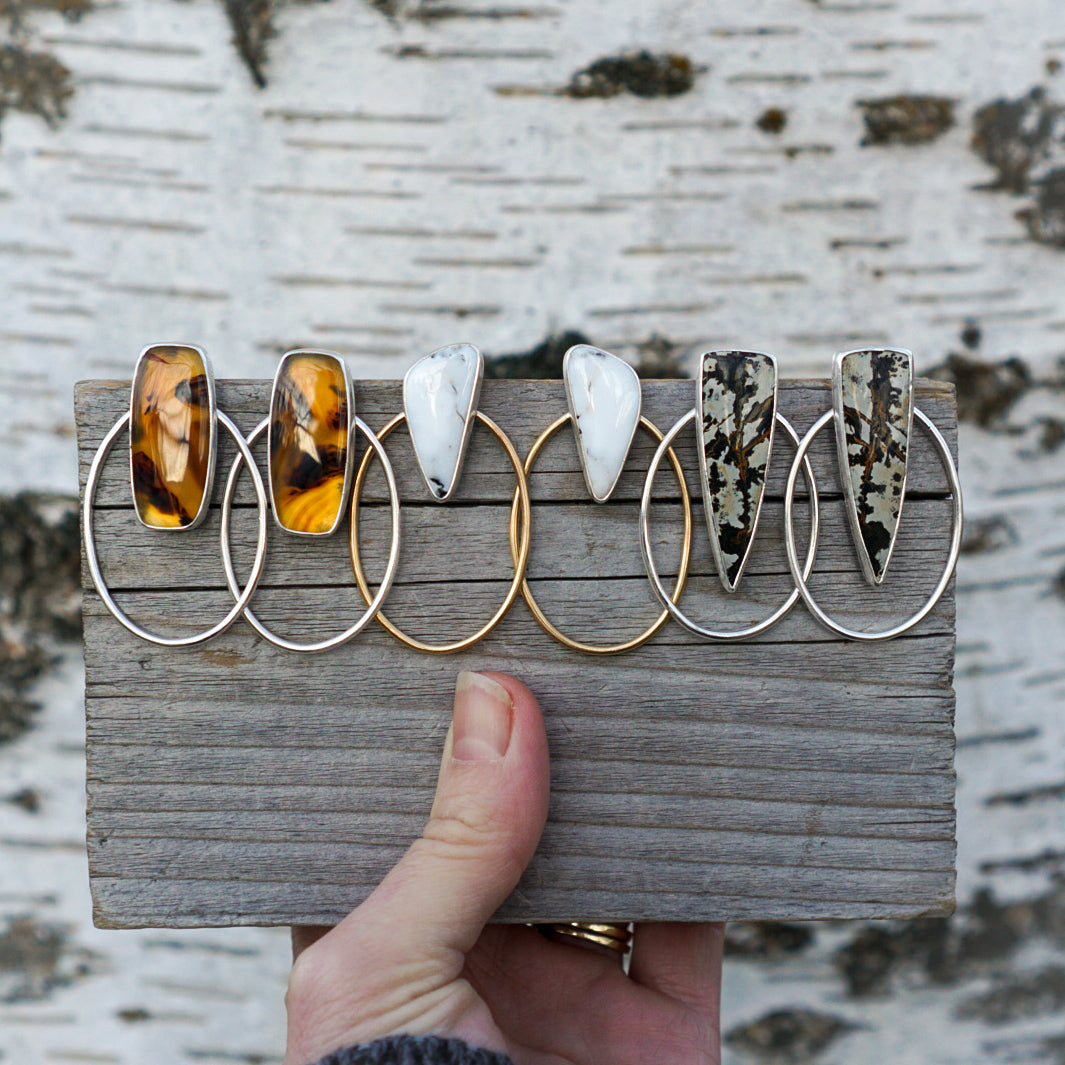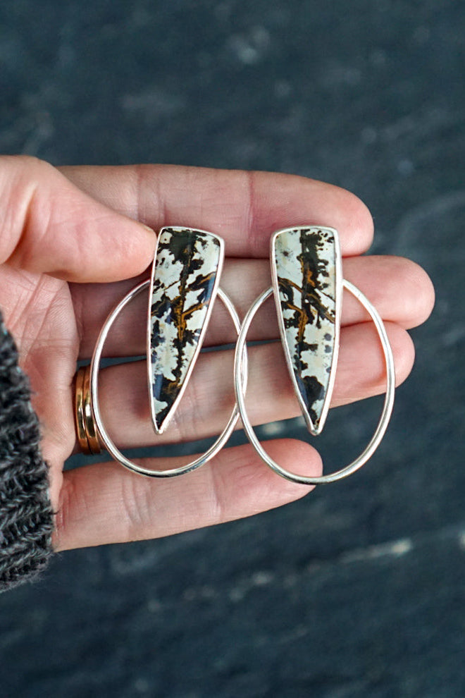 These earrings are my favorite design of the season. They are simple, but unique and eye catching. This pair features stunning slices of black and grey Jasper gemstones (they have a bit of brown n them too) set simply in fine silver with sterling silver oval loops at the bottom. Finished with sterling silver ear posts and comfort clutch earnuts. These measure about 2 inches from the top of the stone to the base of the loop.