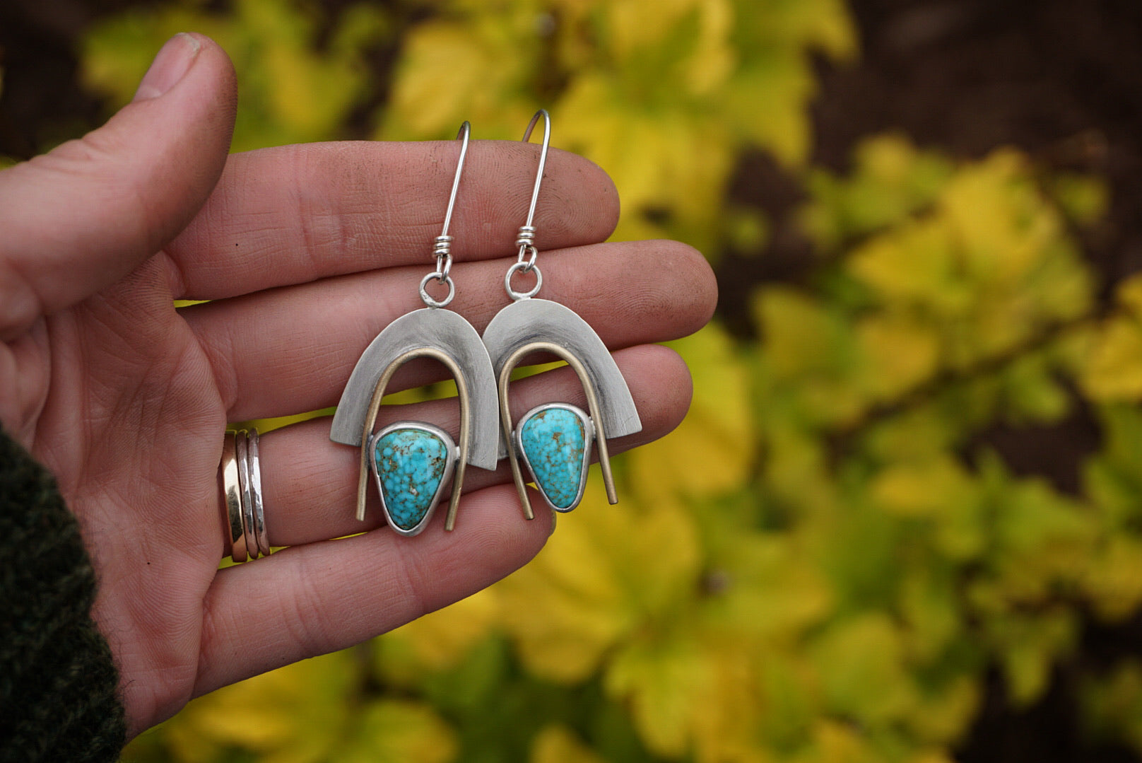 Absolutely stunning pair of earrings featuring high grade American mined Kingman turquoise stones nestled inside arches constructed of raw brass and recycled sterling silver. These are perfect medium sized earrings and light and comfy. Earrings are oxidized and polished for a soft rustic glow and are finished with handmade sterling silver earwires. These hang just about 2 inches long from the top of the earwires to the base or the earring.