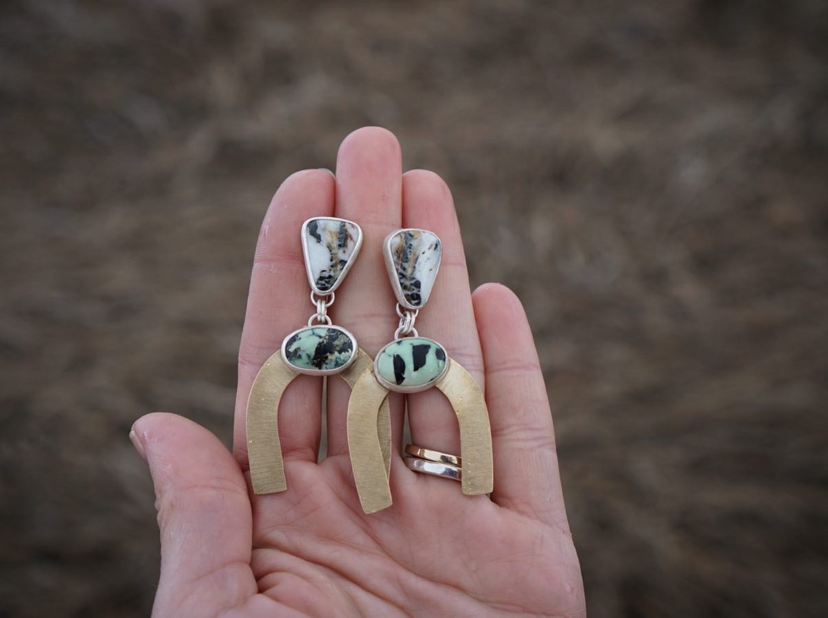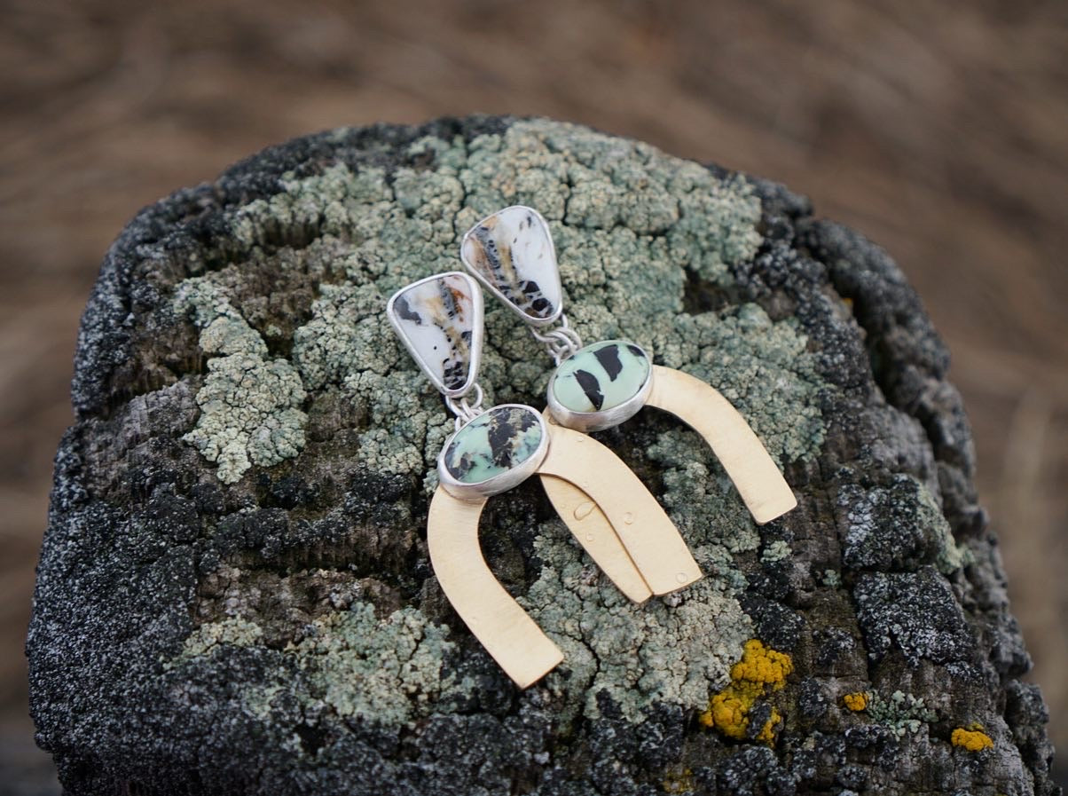 Absolutely stunning pair of earrings featuring gorgeous American mined New Lander Variscite stones with minty green and black matrix perched on top of hand drawn and sawed brass arches. The arches dangle below lovely post earrings of White Buffalo stones with white, black and brown in the matrix. Earrings are hand polished for a soft rustic glow and are finished with handmade sterling silver earnuts. These hang just about 2.25 inches long from the top of the earwires to the base or the earring.