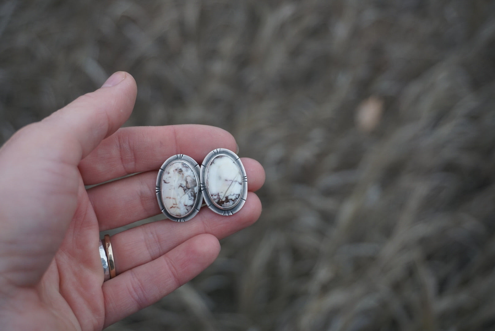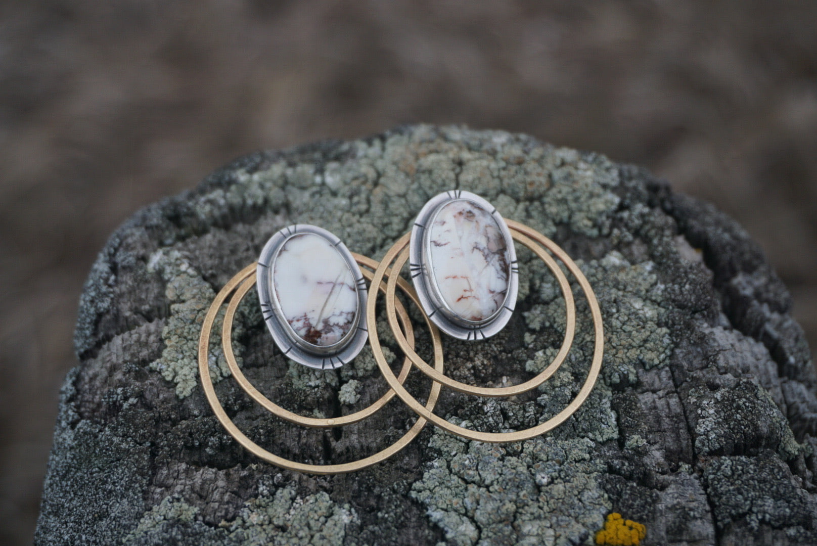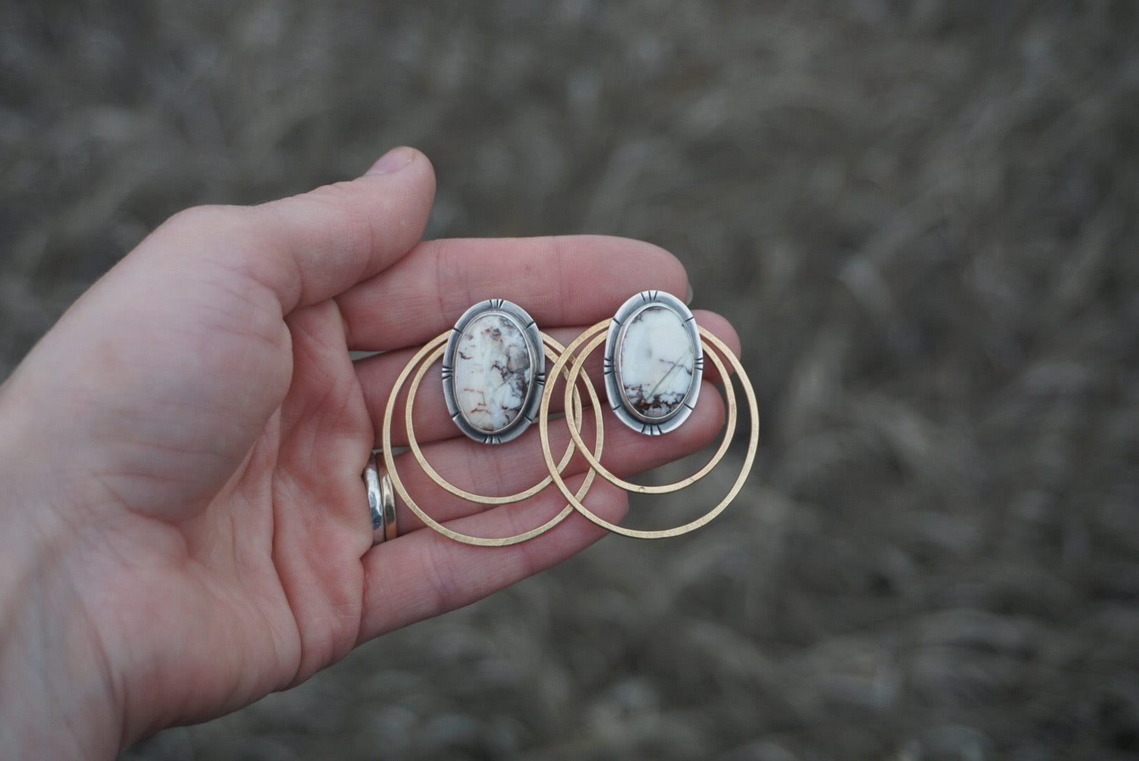 These earrings are a two in one. Simple post earrings with beautiful white, brown and cream Wild Horse stones have accompanying double brass hoops that can be worn together for a statement post, or apart for a simple everyday post earring set. Posts are made of sterling silver with sterling silver earnuts. Hoops are made with jewelers brass. Brass is subject to oxidation and will naturally darken with time. I love how brass looks as it ages, but if it’s not for you, polish on a regular basis to keep them shiny. Hoops measure 1.25 inches in diameter.
