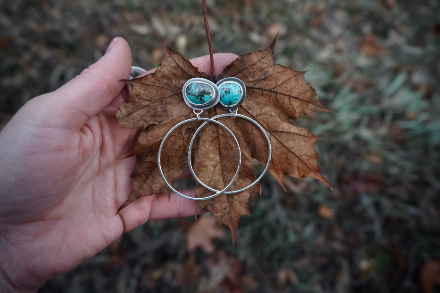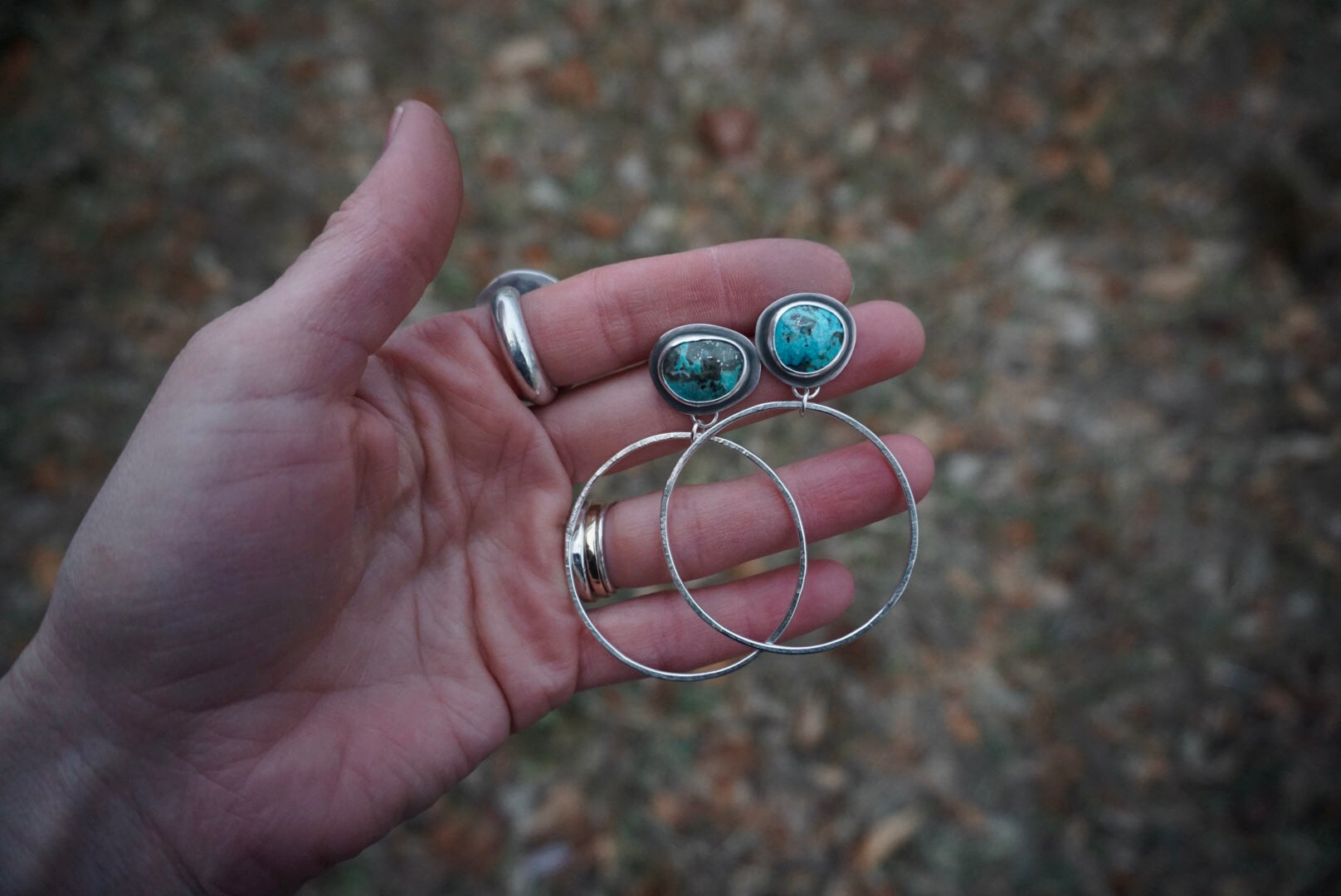 Beautiful all natural blue Kingman Turquoise with beautiful pyrite flecks in the matrix are simply set on handmade posts. Hand formed and hammered hoops dangle below. Earrings are unique and comfortable! These measure about 2.5 inches from the top of the post to the bottom of the hoop. Hoops are about 1.75 inches in diameter. Oxidized for a soft rustic finish and completed with sterling silver earnuts. All handmade, all love.