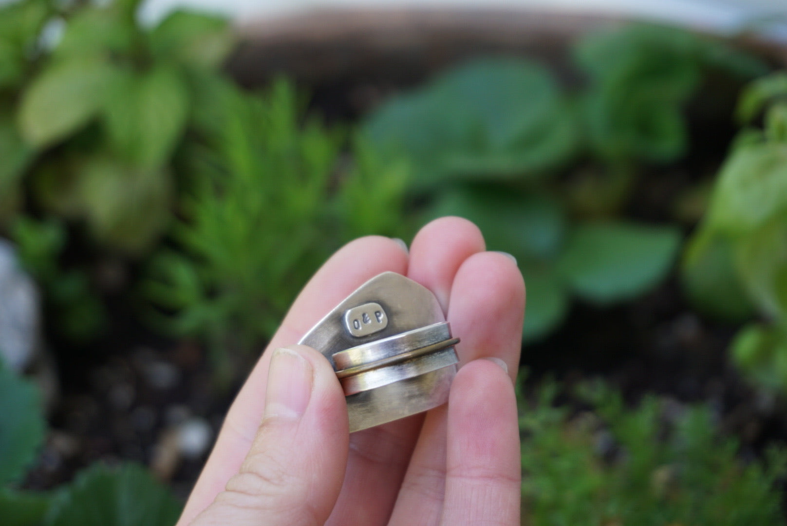 A big and absolutely stunning hunk of Green Turquoise is simply set in fine and sterling silver. This stone is beautiful and has bright light and dark greens, browns and black colors in it’s matrix. Featuring a mid width sturdy band with a strip of layered brass for extra detail. Oxidized and polished for a soft rustic glow and finished with a hand stamped makers mark. Ring measures a size 8.