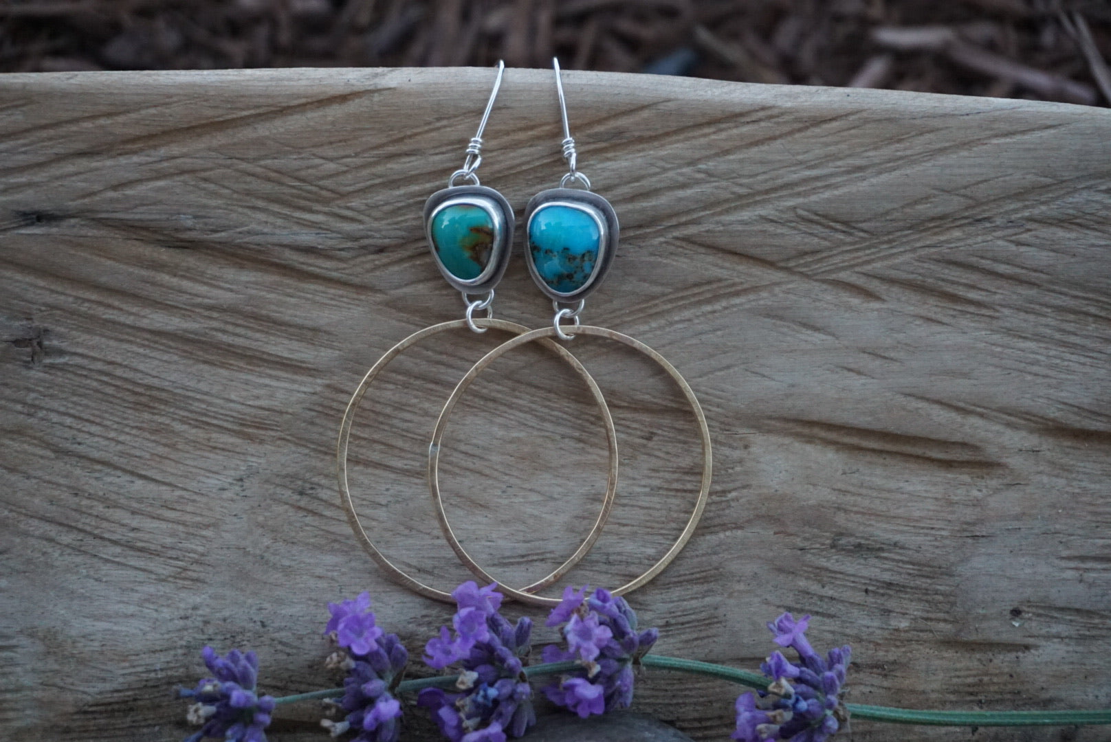 Beautiful medium/large sized everyday hoops featuring gorgeous American mined Kingman blue turquoise and green Globe turquoise gemstones, sister stones for extra character. Earrings are completely handmade from fine and sterling silver with crafted brass hoops and dangle from handmade sterling silver earwires. Hoops measure about 1.75 inches in diameter and hang just over 3 inches long and are extra light and comfy for everyday wear.