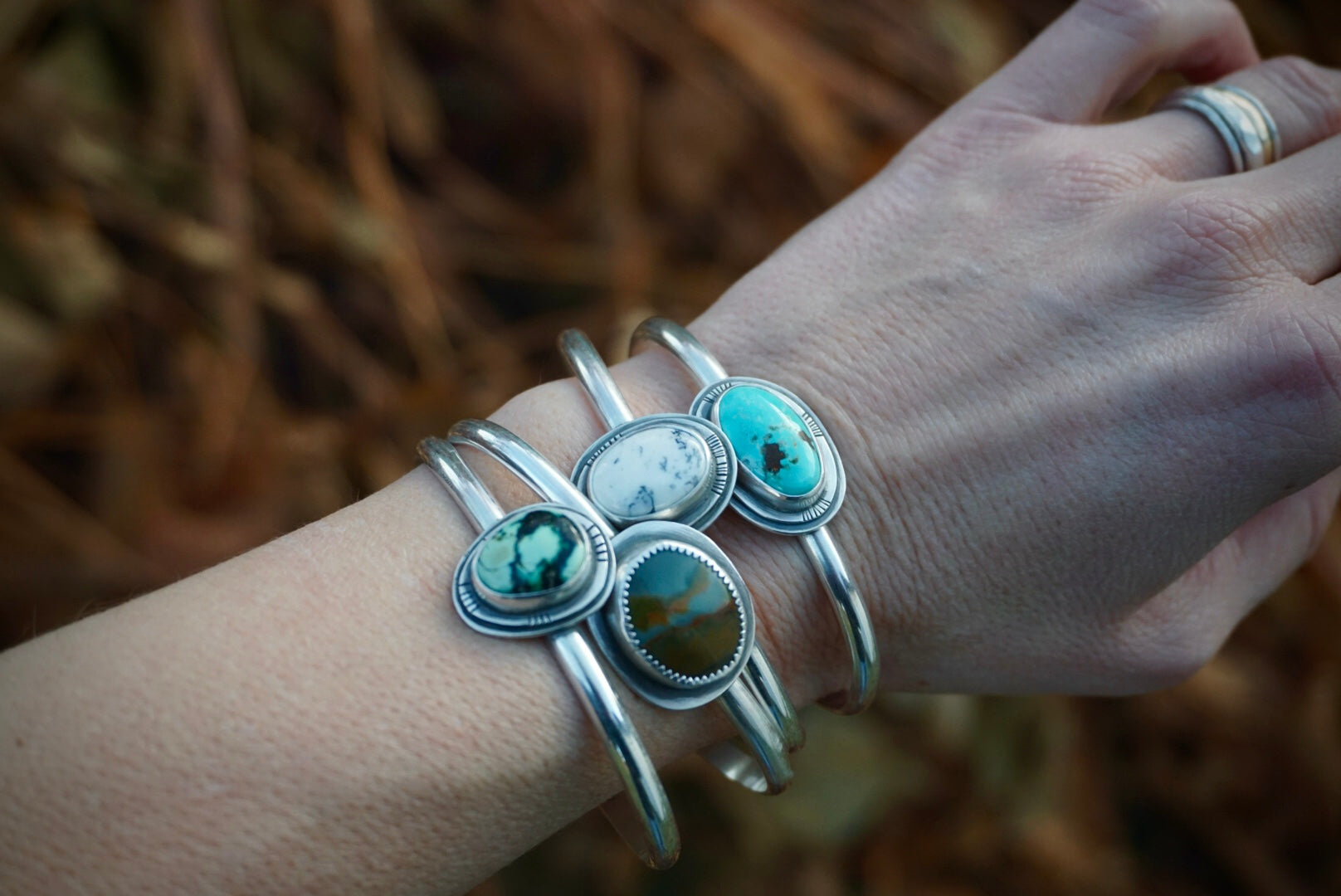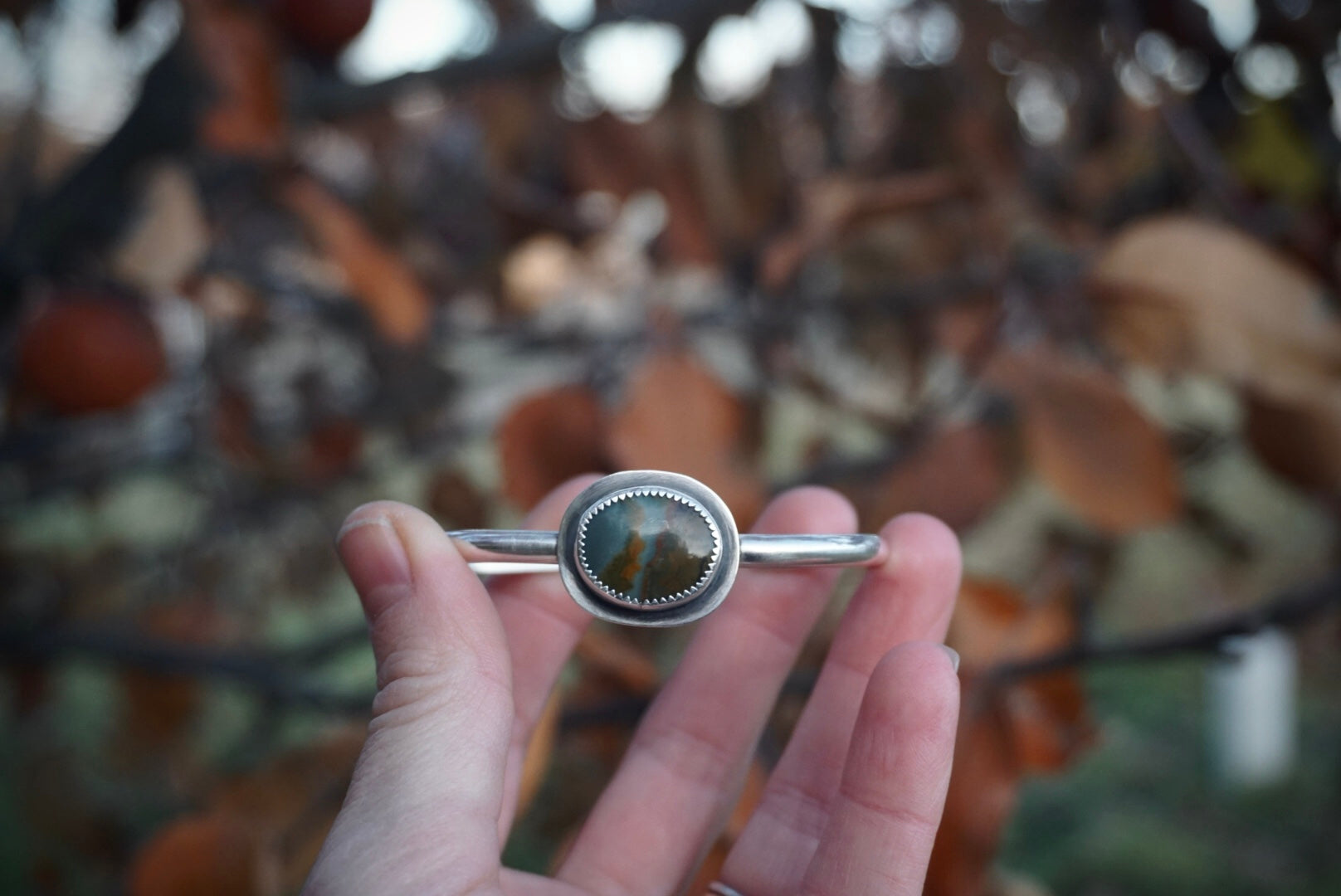 This gorgeous little cuff is perfect for stacking and everyday wear. Featuring sturdy plain half round bracelet with a stunning piece of Landscape Jasper perched atop a thick layer of silver with a pretty serrated bezel. Oxidized and polished for a soft rustic glow. Cuff Is one size fits most and measures 5.5 inches with a 1 inch opening and can be stretched open or squeezed shut for your perfect fit.