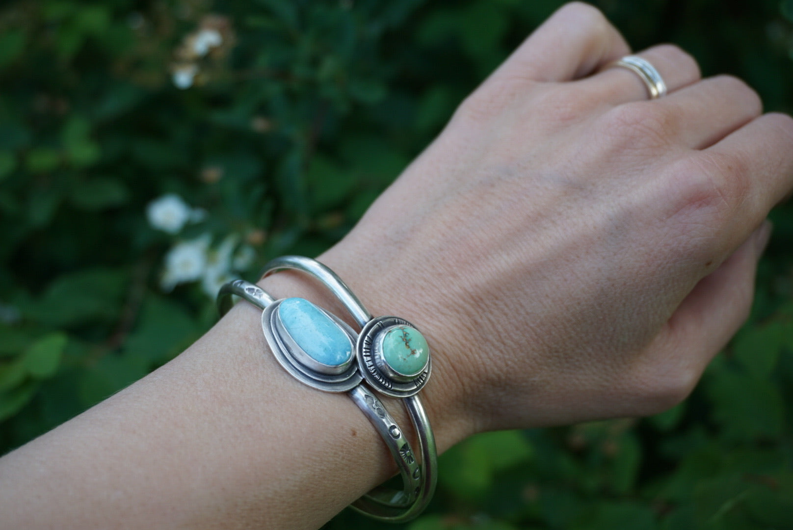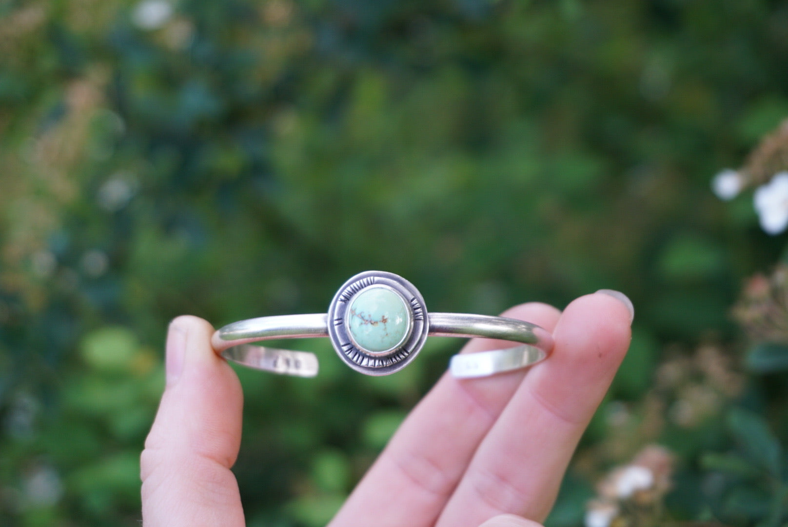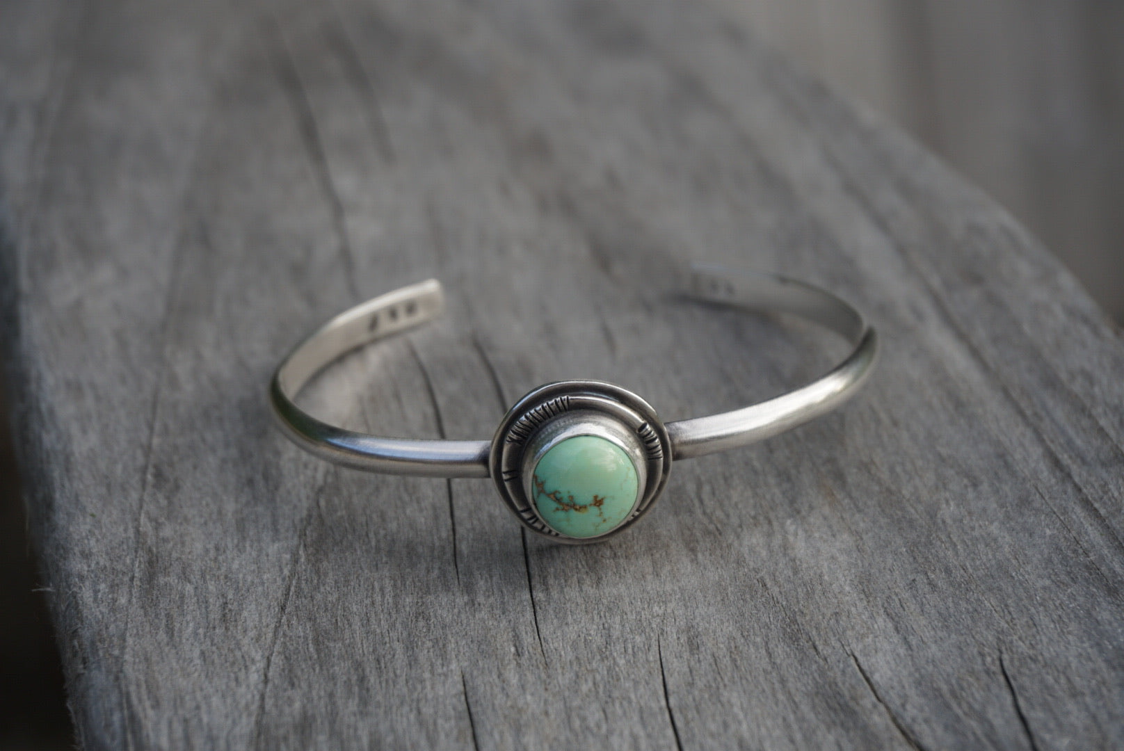 This gorgeous little cuff is perfect for stacking and everyday wear. Featuring sturdy plain half round bracelet with a stunning piece of buttery minty green Poseidon Variscite perched atop two thick layers of silver. Little hand stamped details adorn the edge. Oxidized and polished for a soft rustic glow. Cuff Is one size fits most and measures 5.5 inches and can be stretched open Or squeezed shut for your perfect fit.