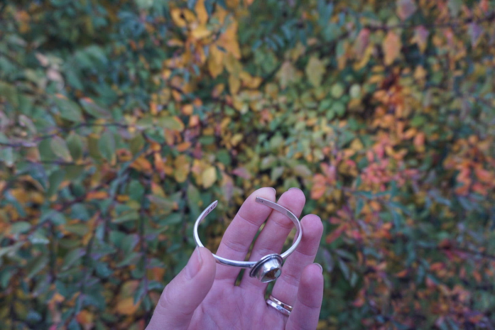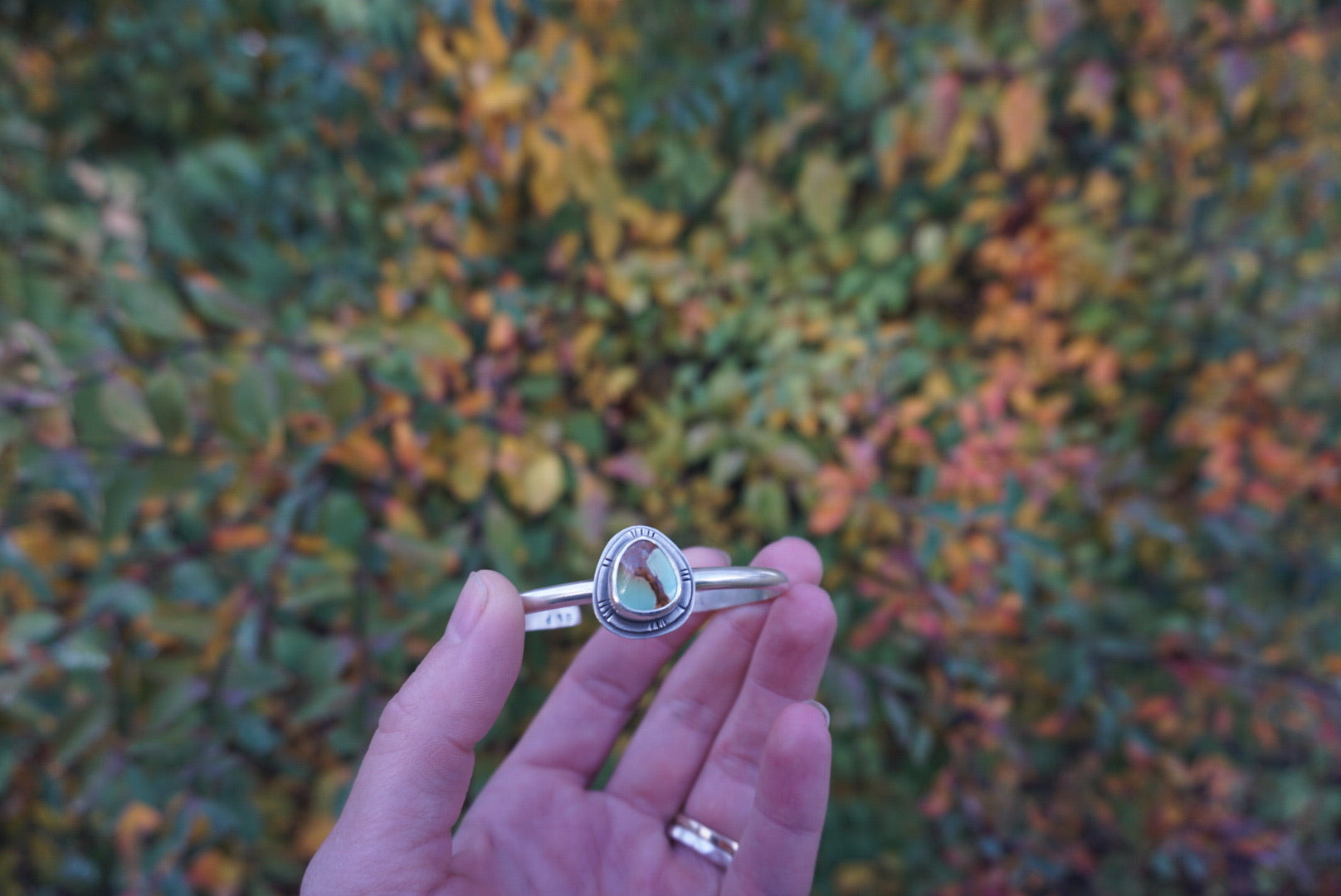 This gorgeous little cuff is perfect for stacking and everyday wear. Featuring sturdy plain half round bracelet with a stunning piece of buttery minty green Royston Turquoise perched atop two thick layers of silver. Little hand stamped details adorn the edge. Oxidized and polished for a soft rustic glow. Cuff Is one size fits most and measures 5.5 inches and can be stretched open Or squeezed shut for your perfect fit.