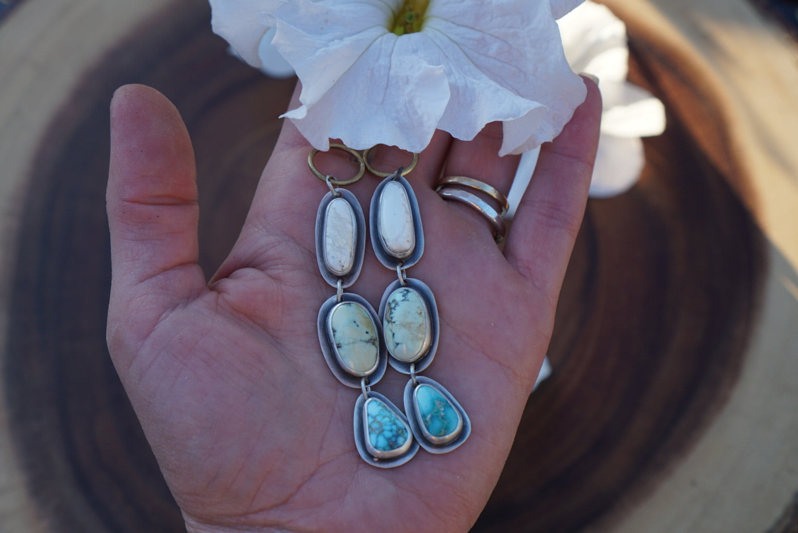 Stunning multi stone earrings featuring White Buffalo, New Lander Variscite, and Cloud Mountain Turquoise all simply set in recycled sterling silver, connected together and dangling from itty bitty brass hoop links. Earrings are completed with handmade sterling silver earwires and dangle about 3.75 inches in length.
