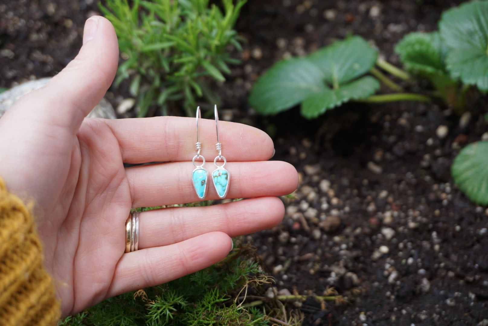 It’s the little things that matter. And, the gorgeous, vibrant, high grade turquoise of these itty bitty dangle earrings will definitely have you feeling that way. Beautiful pieces of Kingman turquoise are simply set in fine and sterling silver and dangle from hand crafted sterling silver earwires. Earrings measure just under 1.5 inches in length from the top of the earwires the tip of the stone. The absolute perfect earrings for everyday.