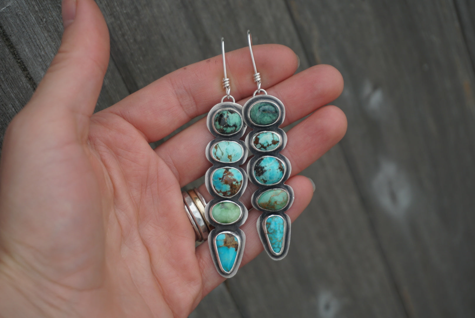 Ten gorgeous turquoise stones are center stage in these amazing earrings. Ten stones!!!! The Turquoise Is Amazing and each boasts different shades of greens and blues, each with unique matrix indicative of their mines. This pair features turquoise from these mines: Kingman, Royston, Sonoran Gold, Carlin, and Number 8. Each earring stacks five different stones atop each other and is simply set to honor the beauty of the gemstones. Earrings are oxidized and polished to make the stones stand out and to give a soft glowing finish. Earrings measure about 3 inches long and hang from handmade sterling silver earwires.