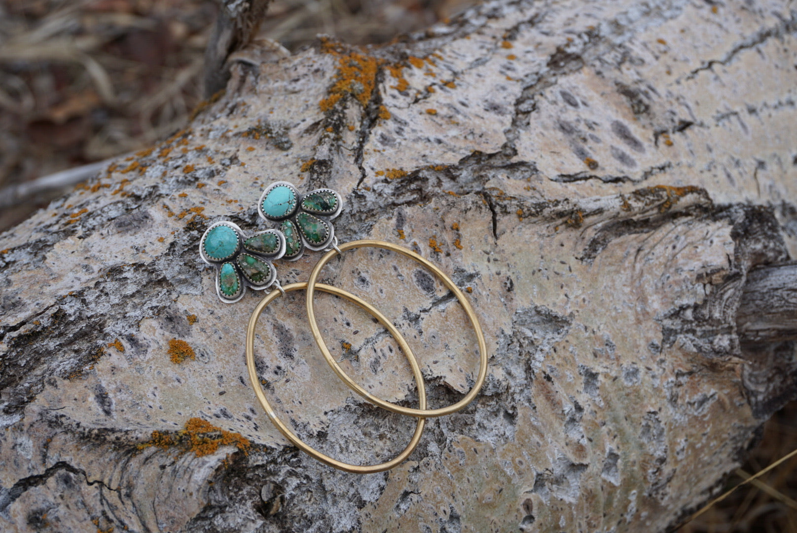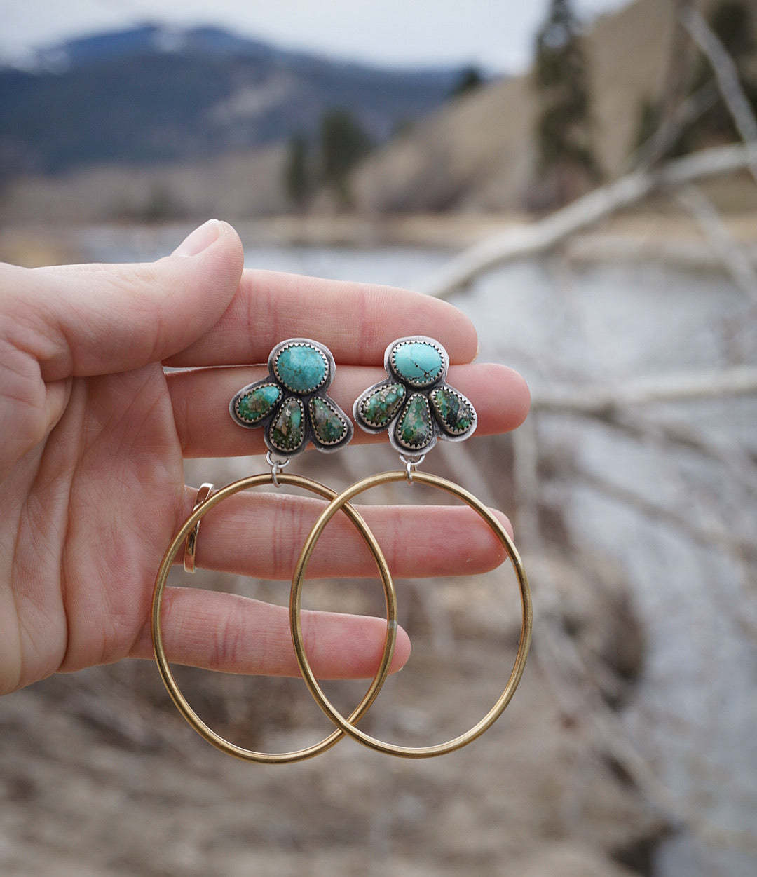 Gorgeous eight stone post hoop earrings featuring two beautiful blue Number 8 Mine Turquoise and six dark green Sonoran Gold Turquoise. Each Wildflower design has the turquoise set in fine and sterling silver and have big oval shaped red brass hoops dangling below. Earrings are oxidized and polished for a soft rustic finish and are finished with sterling silver earnuts. These measure about 3 inches from the top of the post earring to the base of the hoop and they are about 1.75 inches across at their widest point.