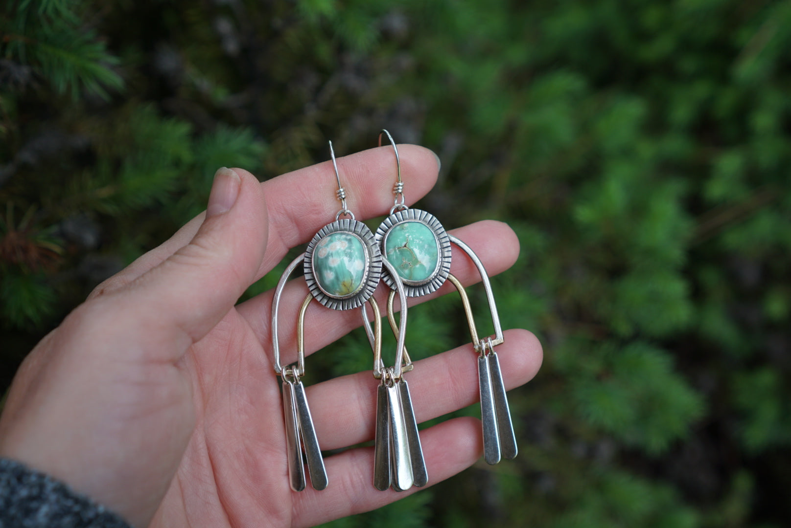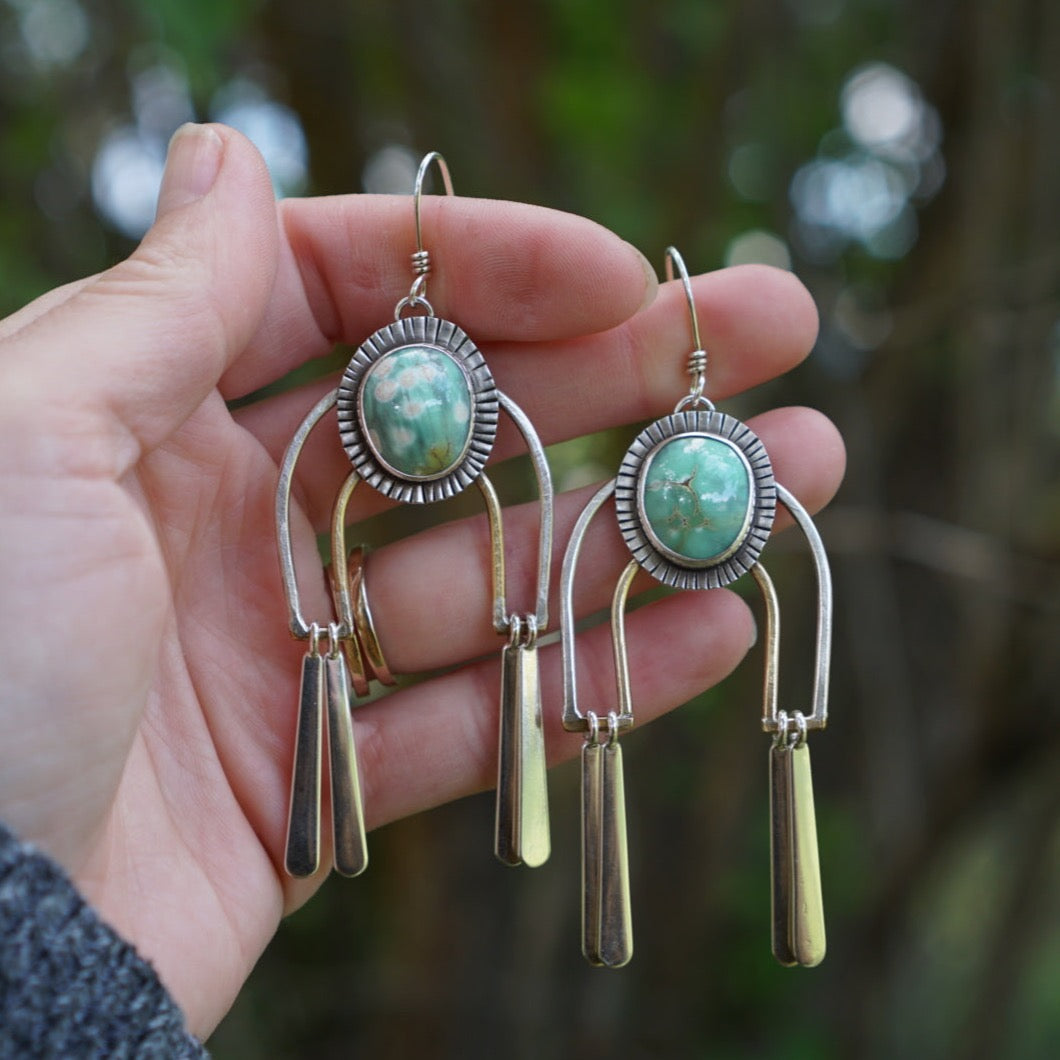Absolutely stunning pair of earrings featuring gorgeous American mined Nevada Variscite stones nestled inside sunburst settings and perched atop arches constructed of recycled sterling silver and brass arches with silver fringe dancing on each side of the arch. Earrings are oxidized and polished for a soft rustic glow and are finished with handmade sterling silver earwires. These hang just about 3.25 inches long.