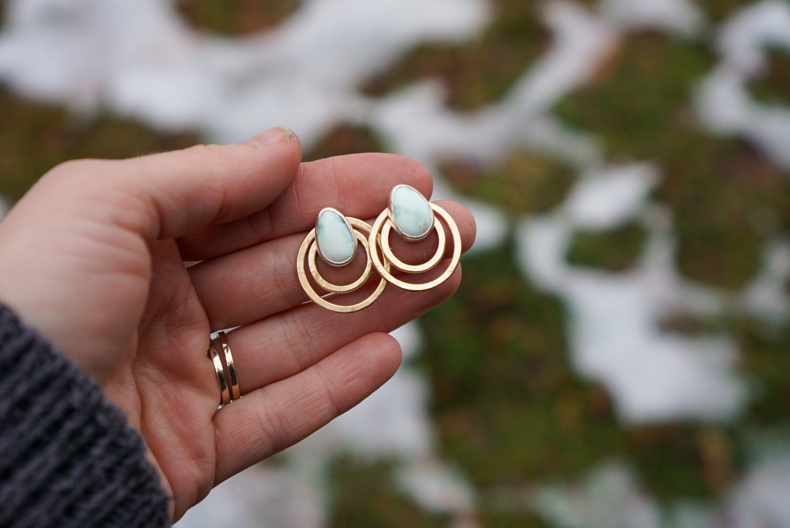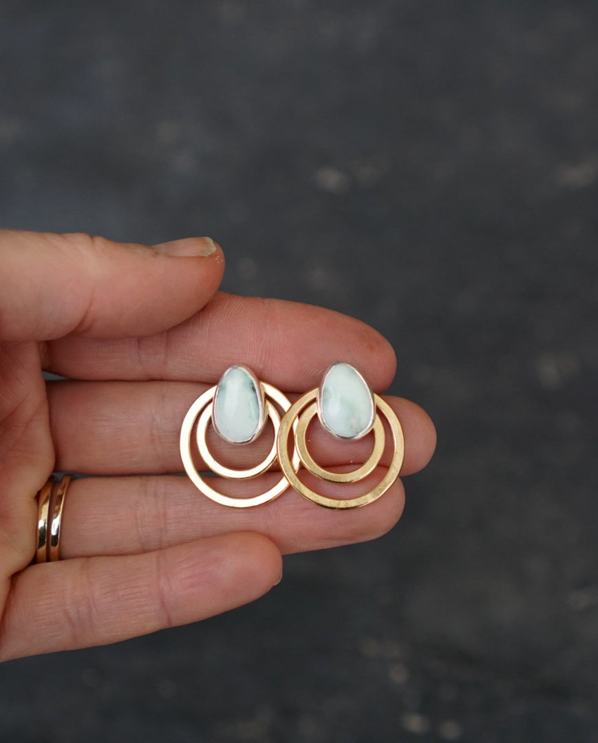 These earrings are a two in one. Simple post earrings with incredible watercolor-like milky green Paloma Variscite gemstones.These have accompanying double brass hoops that can be worn together for a statement post, or apart for a simple everyday post earring set. Posts are made of sterling silver with sterling silver earnuts. Hoops are made with jewelers brass. Brass is subject to oxidation and will naturally darken with time. I love how brass looks as it ages, but if it’s not for you, polish on a regular basis to keep them shiny. Hoops measure a little over .75 inches in diameter.