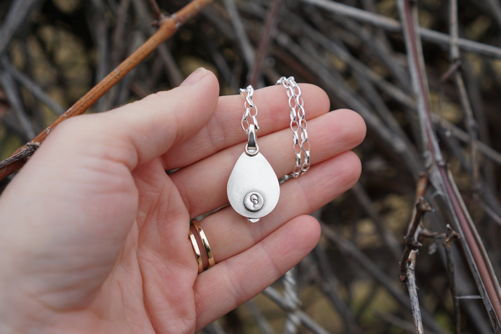 This beautiful pendant necklace features a lovely slice of blue American Mined Turquoise set in silver and perched on two sturdy layers of sterling. A little hand stamped organic shaped floret is nestled at the base of the pendant . This pendant is strung on a sturdy sterling silver oval rolo chain that measures 16 inches in length.
