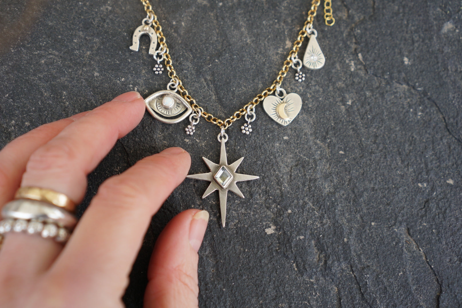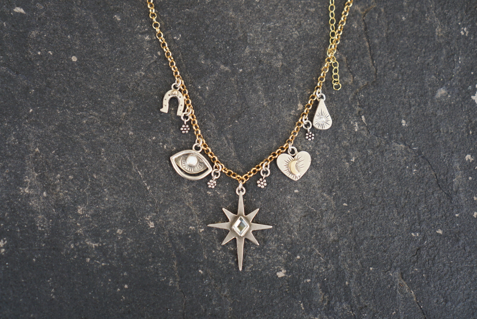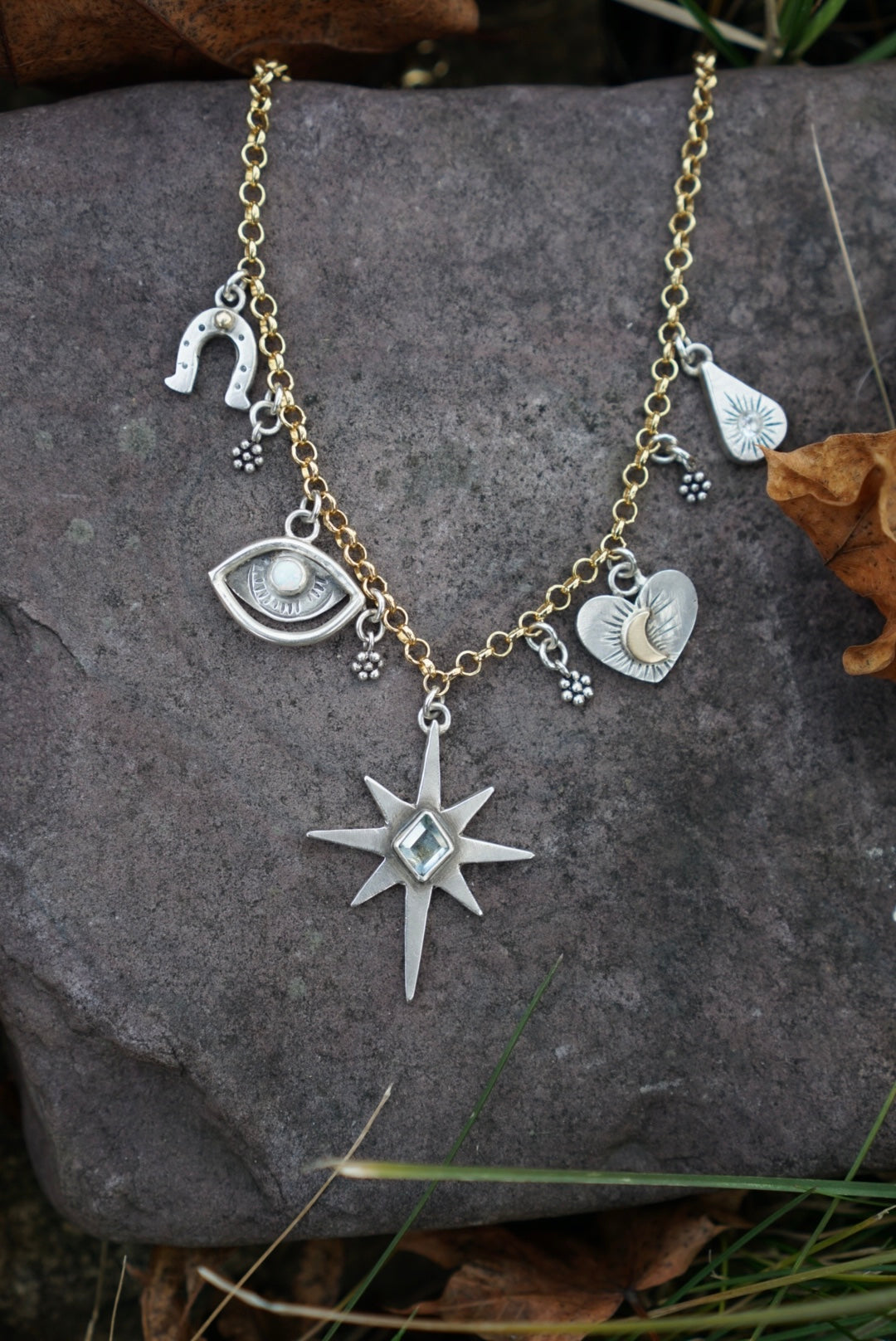 This necklace was a labor of love and is truly one of my most favorite things I've created. Each charm is made from reclaimed silver that I processed myself by melting down scrap silver and rolling it out into thick sheet. I then forged and sawed each charm, adding gemstones, 10K Gold accents and hand stamped details. This necklace features a horseshoe charm with a little 10k gold ball accent, an eye charm with a Kyocera Opal and hand stamping, a North Star charm with a gorgeous steel blue grey portrait cut Montana Sapphire, a heart charm with a 10k gold crescent moon in the center, and a Tear charm with a flush set cubic zirconia and hand stamping. Tiny little flower charms dangle in between each larger charm and they all dangle on a 14k Gold fill rolo chain. The chain measures 15 inches in length and has a 2 inch extender allowing for adjustment up to 17 inches in length. Necklace is finished with a 14k gold fill lobster clasp.