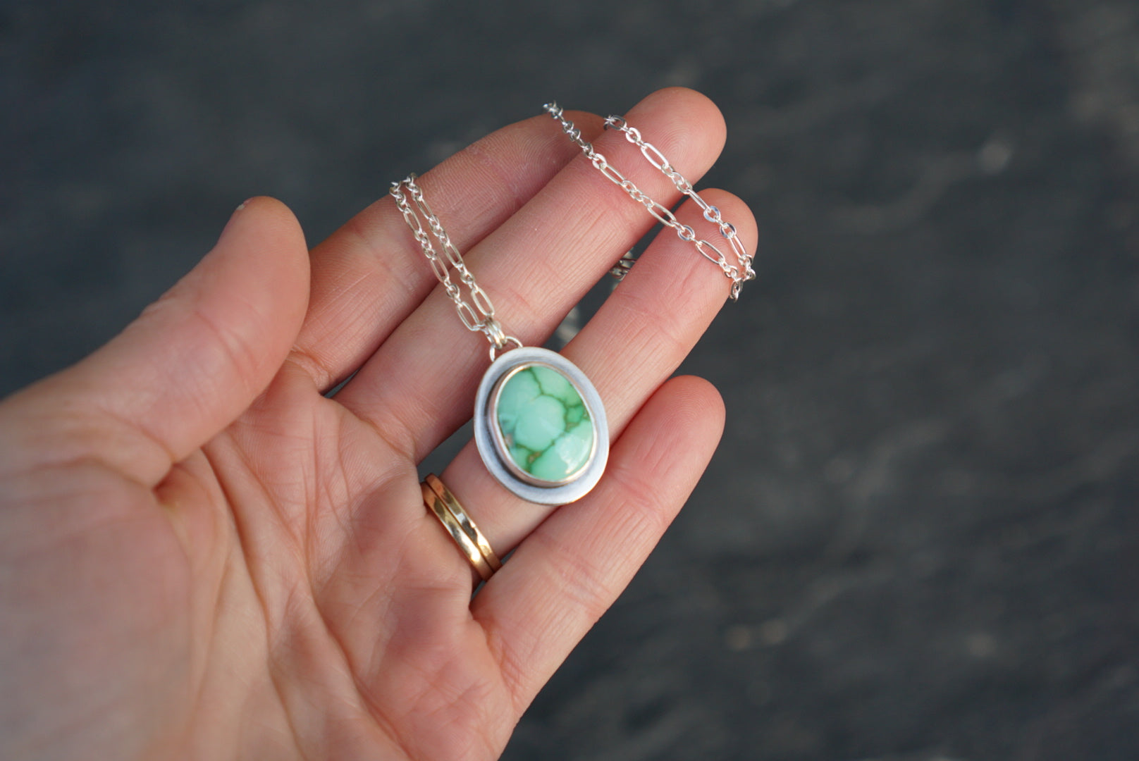 A wonderfully simple necklace and perfect for the everyday, this beauty features a Verde Valley Turquoise gem with stunning matrix of light and dark green with flecks of tan. It's set simply and beautifully in silver. The pendant hangs from a sturdy long and short style link chain that measures 18 inches long.