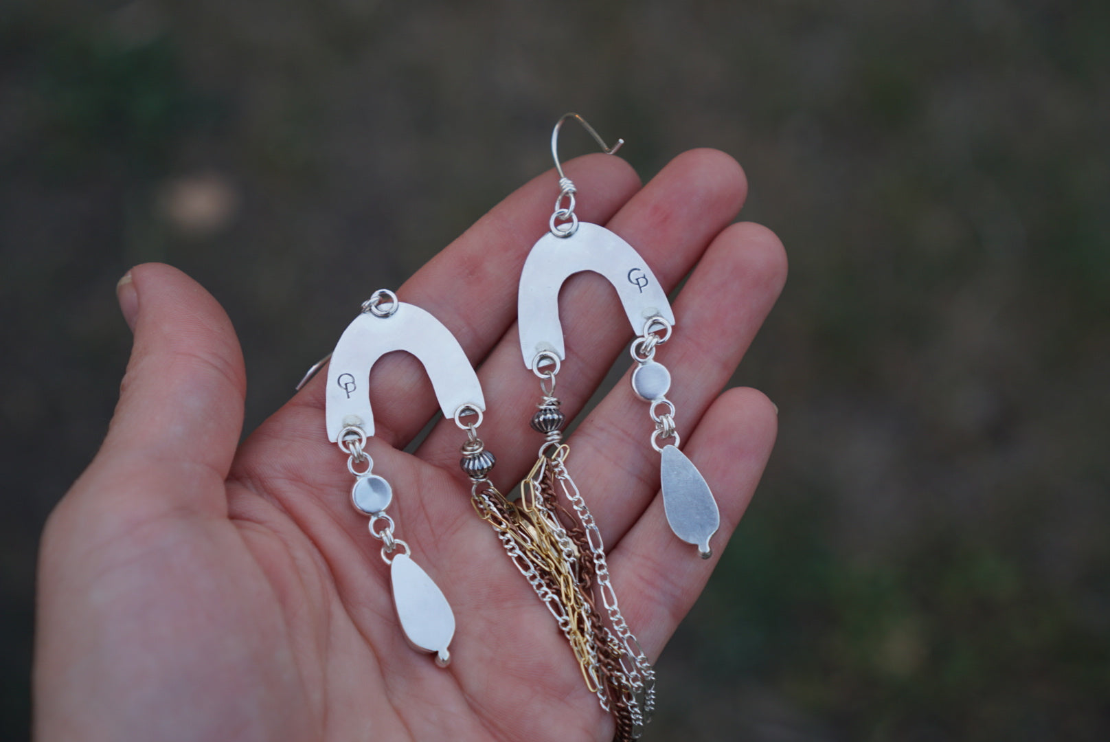 Absolutely stunning pair of earrings featuring hand cut brass arches with cascading chain and freshwater pearl dangles on one side and night sky charm and pearl dangles on the other side. The asymmetric design creates gorgeous movement and texture to these unique beauties. These measure about 4.5 inches in length from the earwire to the longest chain dangle and are super lightweight and are finished with handmade sterling silver earwires.