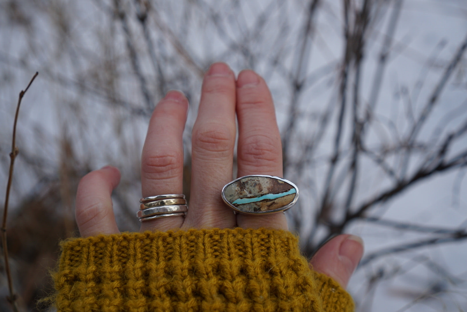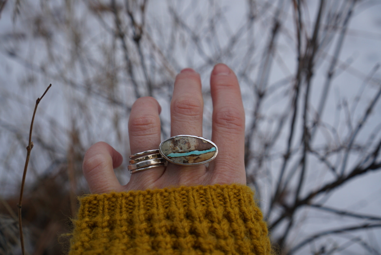 A beautiful thick hunk of Royston Ribbon Turquoise is simply set in sterling silver with a simple sturdy extra wide domed ring band. A very interesting stone with cream, tan and brown matrix and a little robins egg blue turquoise river running through the middle. This is an all natural stone and has some texture and light pitting to the stone which makes it all the more beautiful and unique. Oxidized and polished for a soft rustic finish. Ring is a size 6