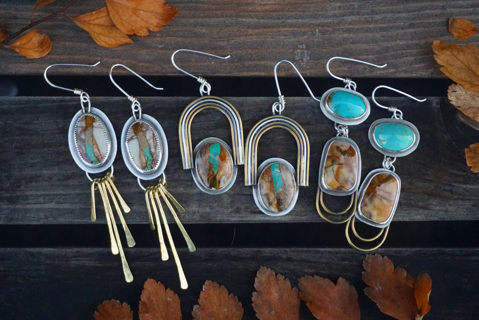 Absolutely stunning pair of earrings featuring gorgeous American mined Royston Ribbon turquoise stones nestled inside Rainbows constructed of raw recycled sterling silver and brass. Earrings are oxidized and polished for a soft rustic glow and are finished with handmade sterling silver earwires. These hang just about 2.5 inches long from the top of the earwires to the base or the earring.