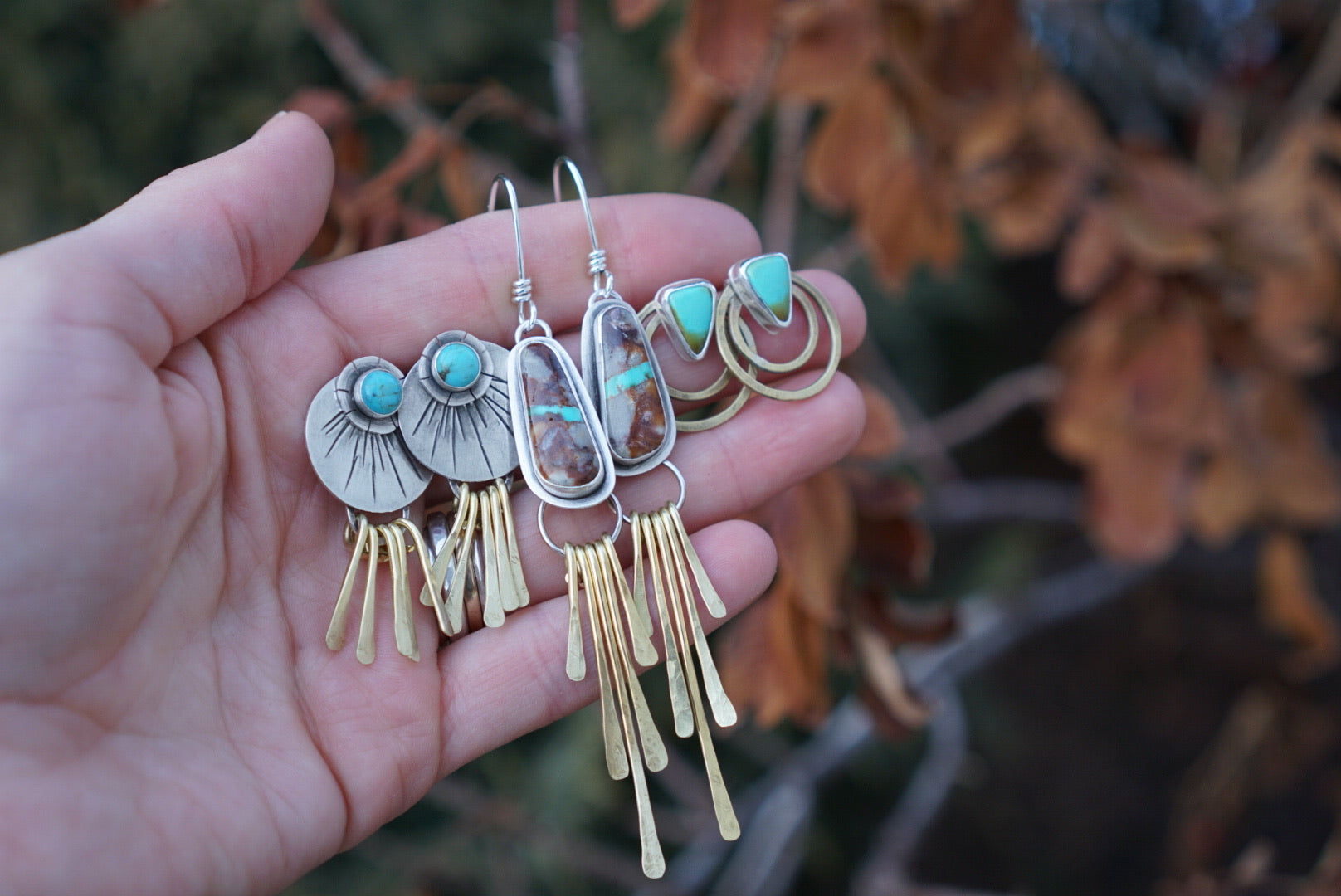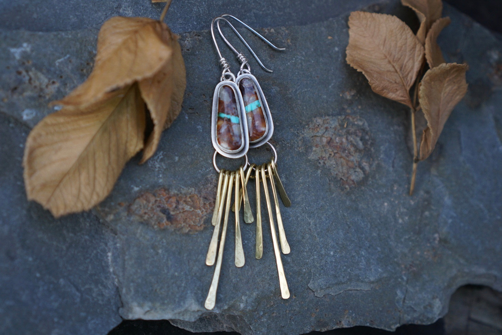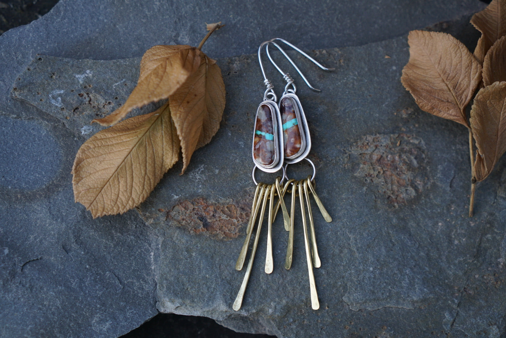 These earrings are a two in one. Simple earrings with beautiful Royston Ribbon turquoise stones that have accompanying detachable brass fringe dangles.. The pieces can be worn together for a statement earring, or apart for a simple everyday earring set. Earrings hang from handmade sterling silver earwires and are oxidized and polished for a soft rustic look. Earrings measure just over 3.5 inches in length with the fringe and 1.75 without.