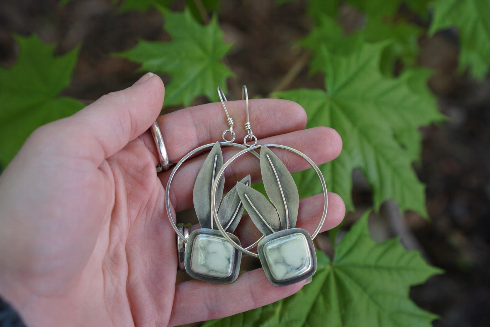 Lovely earrings featuring hand fabricated leaf designs in the center of medium sized sterling silver hoops. Nestled long the bottom are gorgeous slices of Ivory Creek Variscite. Earrings dangle about 3 inches long and are finished with hand crafted Sterling silver earwires. Oxidized and polished for a soft rustic finish. These are sure to WOW!