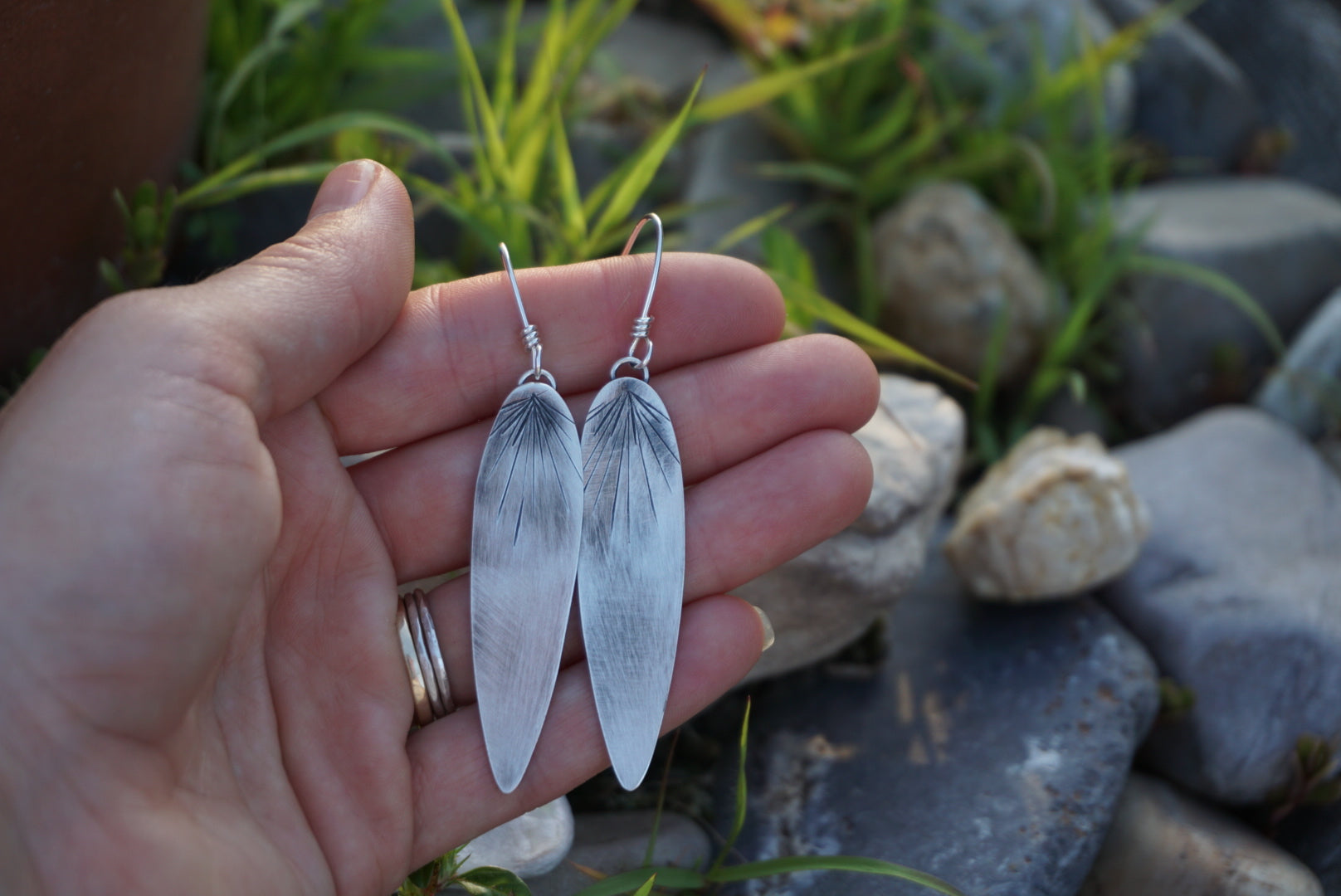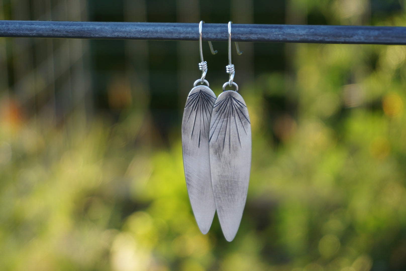 Simple sterling silver dangles. Hand cut points with hand stamped sunburst details. Brushed finish. Oxidized and polished for a soft rustic finish. Handcrafted sterling silver earwires. Earrings measure about 2.75 inches from the top of the earwires to base of the points. All handmade, all love.