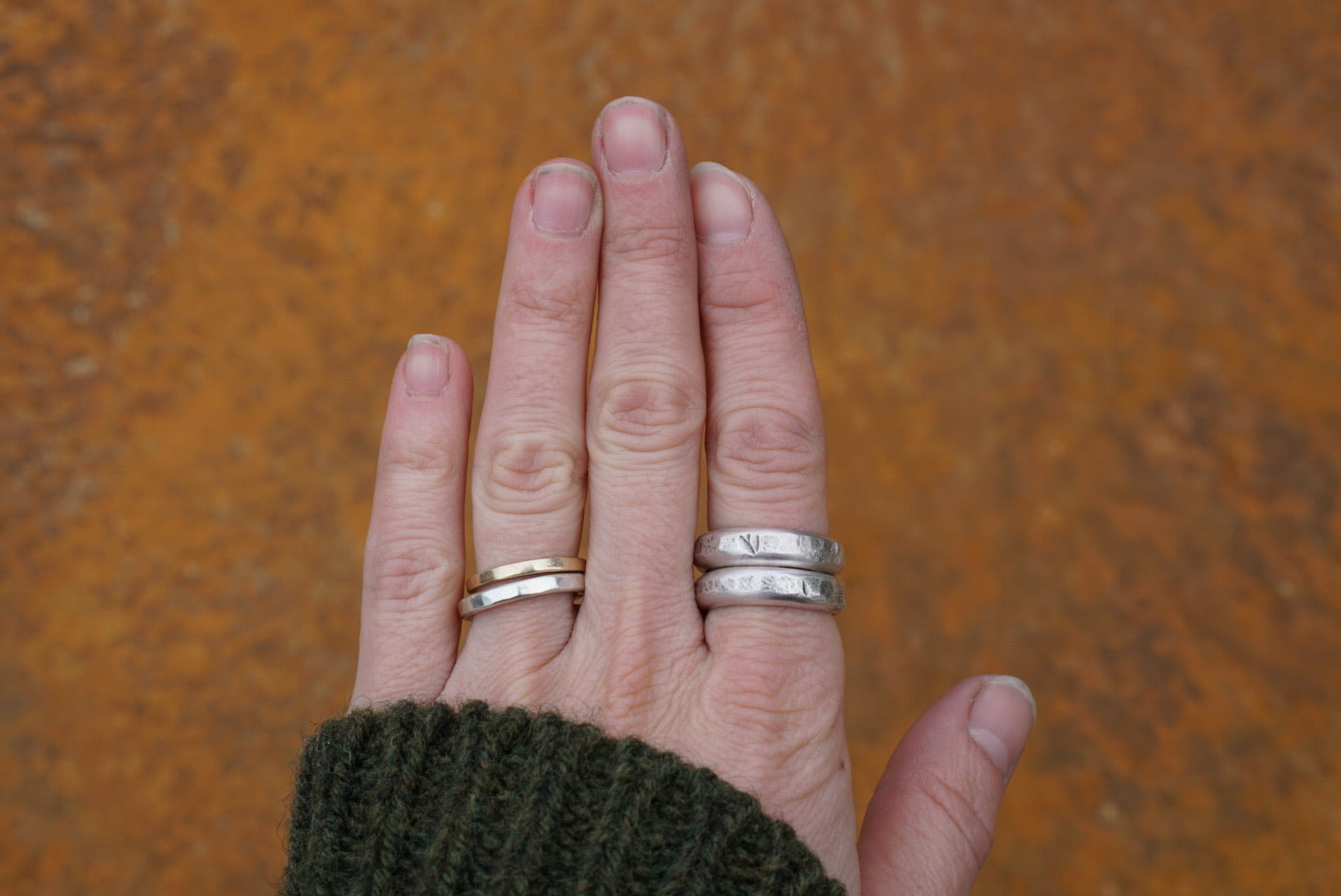 A thick square chunk of Turquoise is set in a wide bezel setting and perched atop a thick rustic hammered ring band and accompanied by two extra wide and hammered half round domed stacking bands. These rings are the perfect for the everyday and can be worn all together or individually. Oxidized and polished for a soft rustic finish. Ring is a size 6.5.