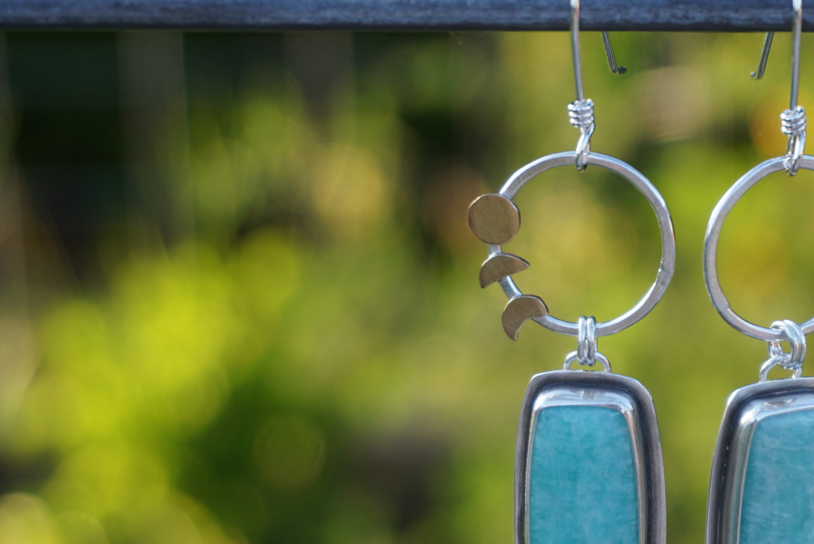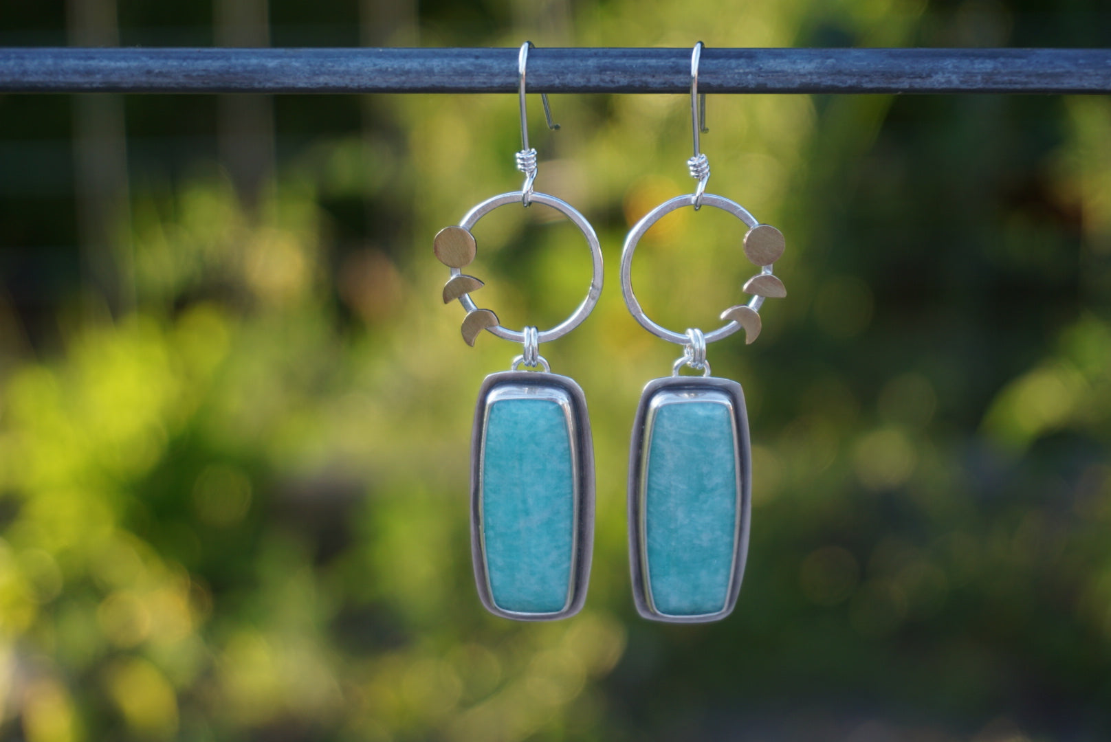 Gorgeous slices of aqua blue Amazonite are simply set In silver and dangle beneath small handmade hoops with little brass moon phases adorning the edge. Finished with handcrafted sterling silver earwires. Earrings are oxidzed and polished for a soft rustic finish and measure just over 3 inches from top to bottom.
