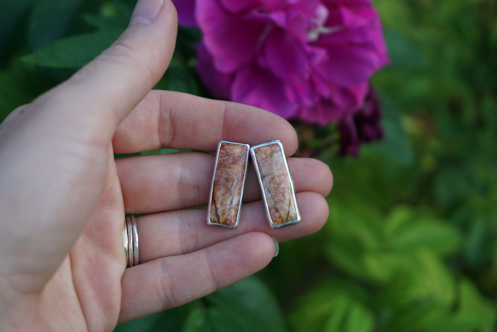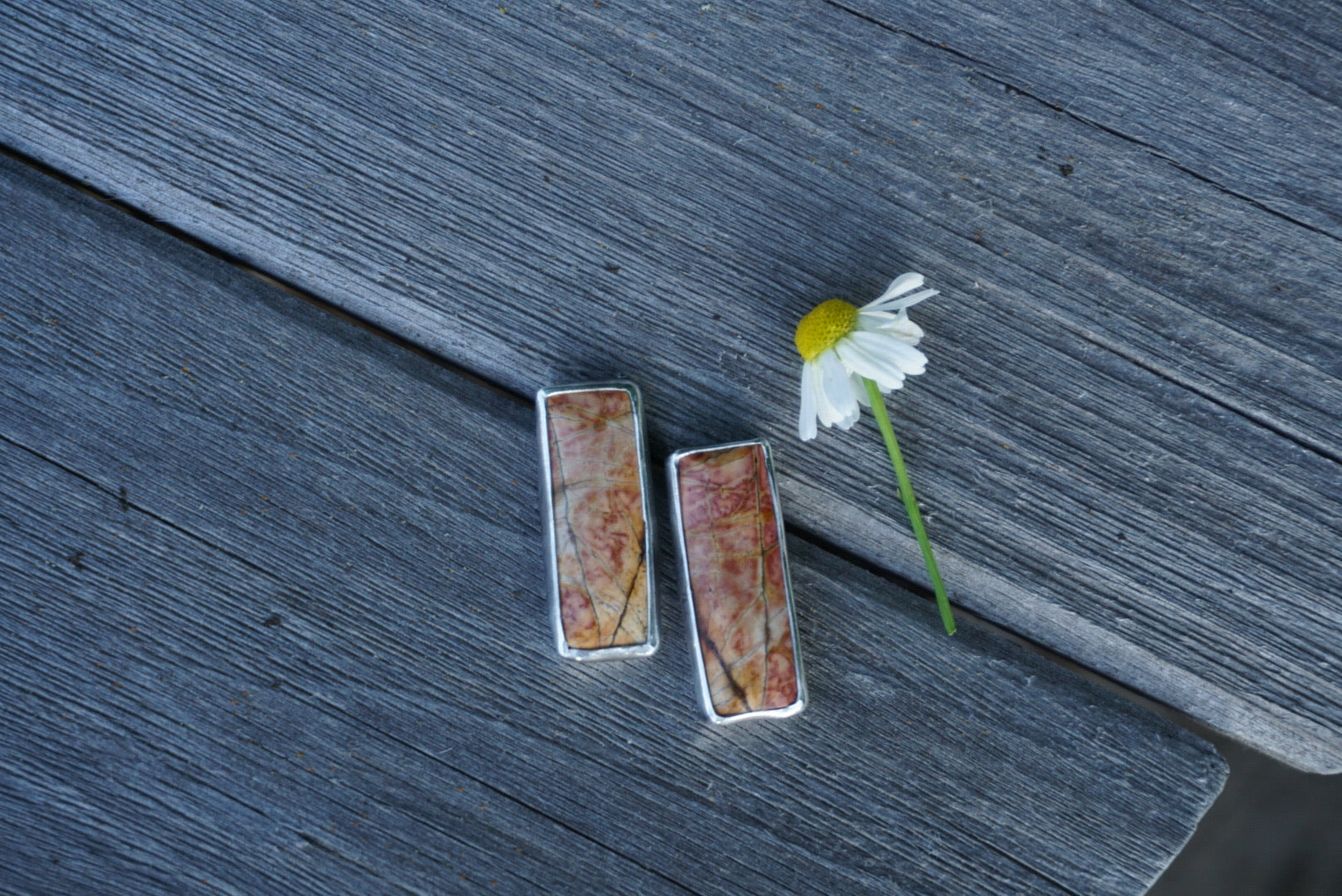 The perfect posts. Fantastic slices of Earthy pink, orange, yellow, and cream Picasso Jasper bars are simply set in thick Sterling Silver. Posts are sturdy and comfortable with sterling silver earnuts. Earrings are oxidzed and polished for a soft rustic finish.