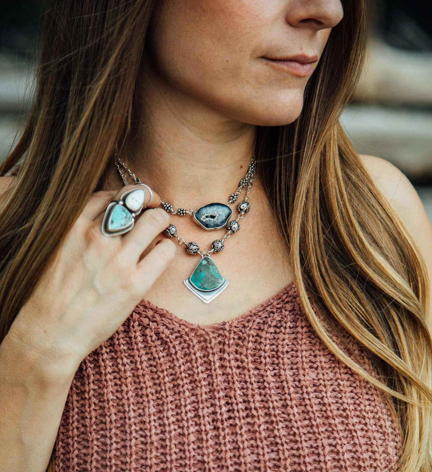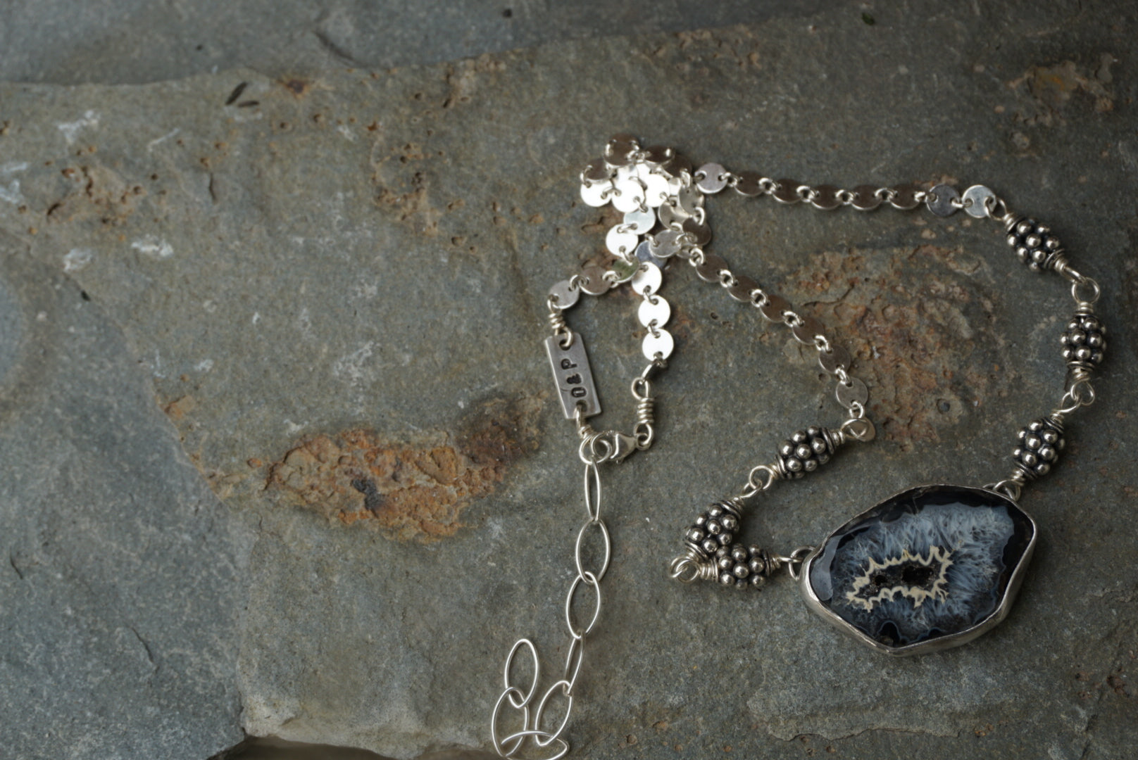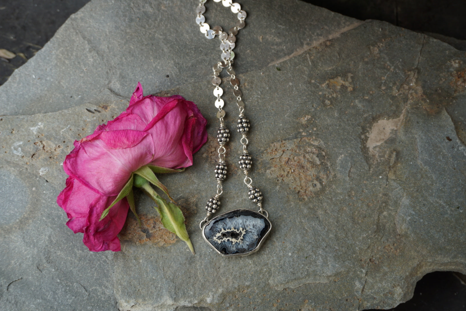 This stunning choker features a beautiful piece of black agate geode, with a little druzy cave in the stone; simply set in sterling silver. The pendant is complimented by six incredible rare handmade vintage Tibetan beads wire wrapped and attached to a sturdy coin and link chain. Necklace measures 14 inches in length with a 2 inch extender for adjusting, and finished with a lobster clasp. There will never be another choker like this, one of a kind in every way.