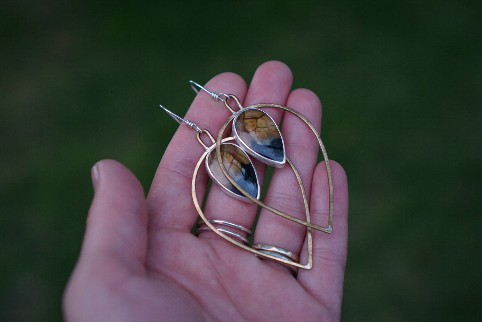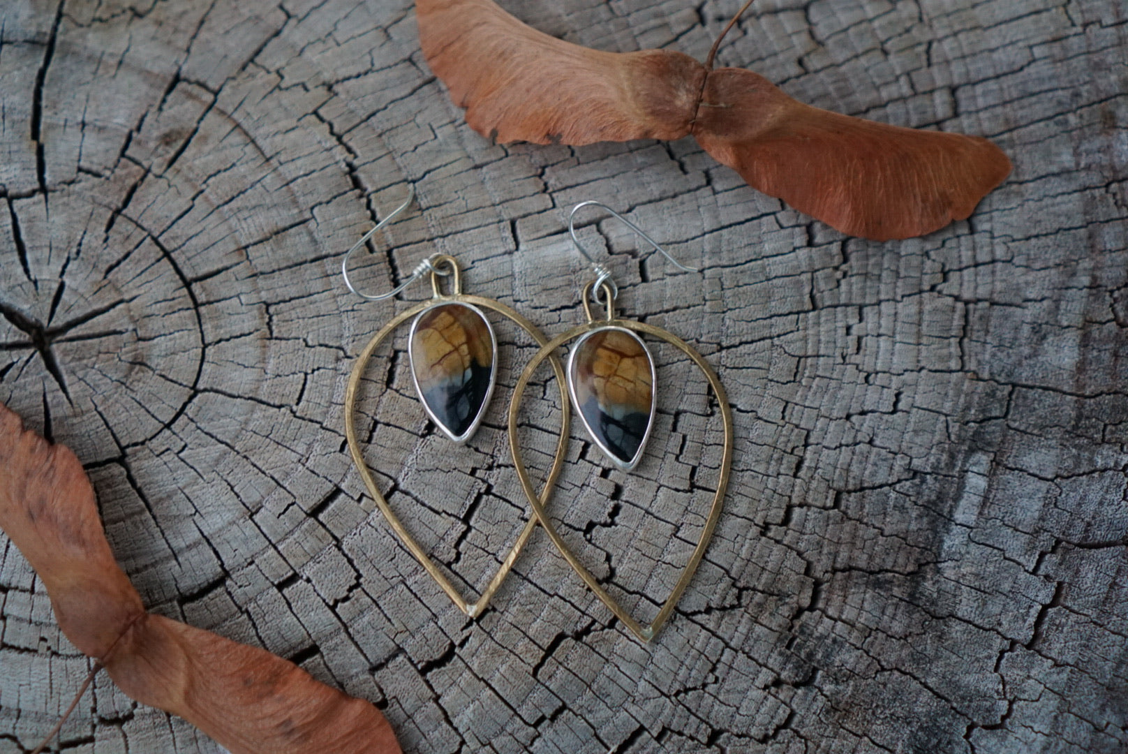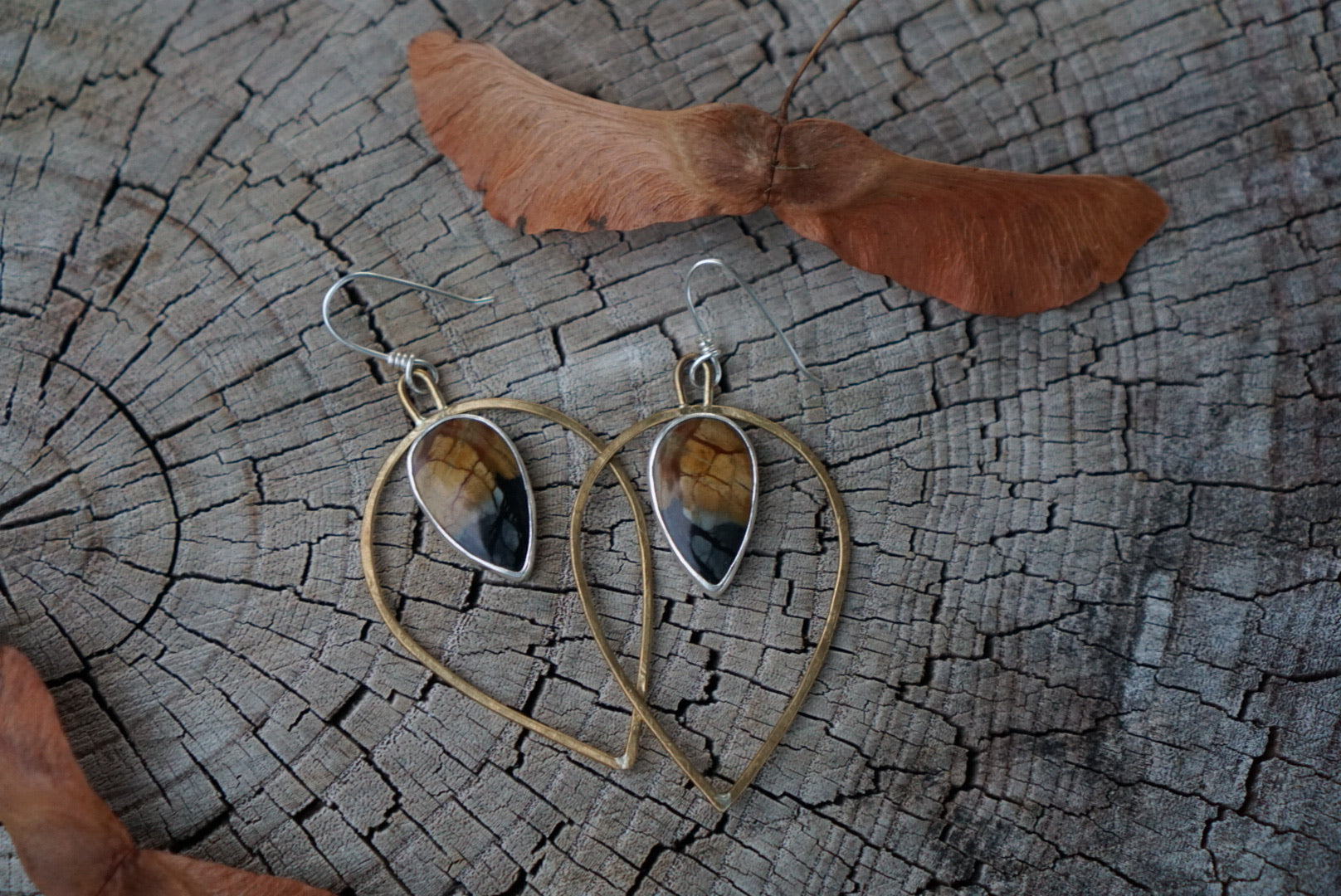 This fun design features Beautiful dark Picasso Jasper with Black a brown matrix, simply nestled in sterling silver and perched inside petal shaped brass hoops. A great combo of metals and a little rustic and little elegant. Finished with handmade sterling silver earwires. Earrings dangle about 3 inches from the top of the earwire to the base of the stone.