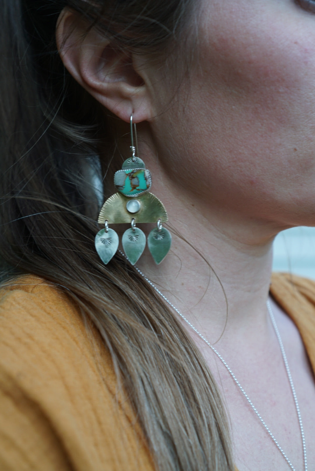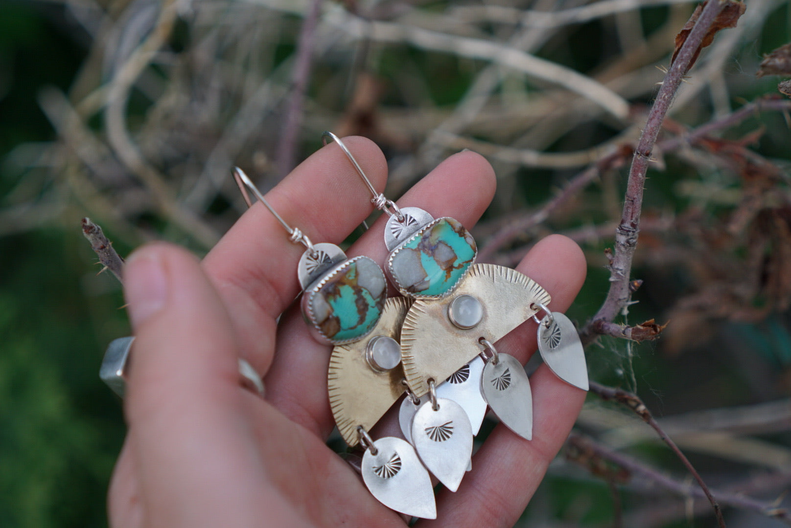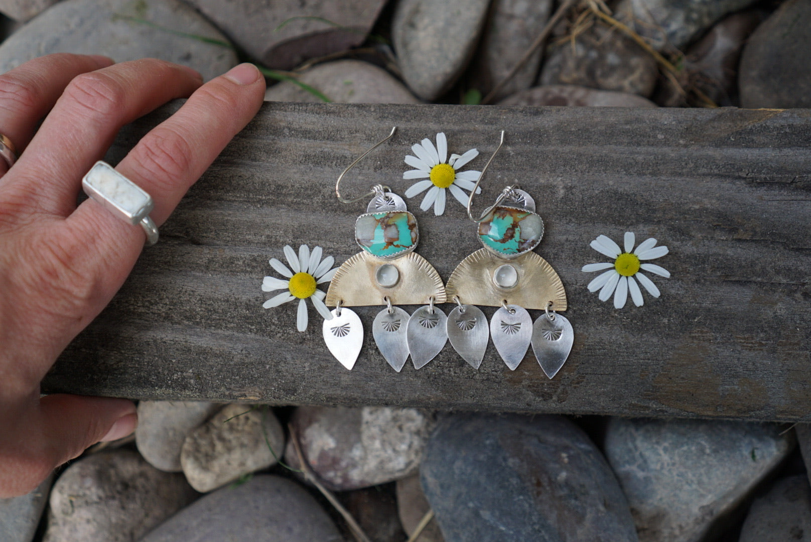 These earrings have so much movement and would be perfect for summer dancing! Featuring half moon shape brass discs with shimmering little white Selenite stones nestled in the center and gorgeous slices of Royston Turquoise above, hand stamped details along the upper edge and three sterling silver hand stamped tear drop charms hanging from the bottom. Finished with hand crafted earwires complete these beauties. Oxidized and polished for a soft rustic glow. Measure about 2.75 inches from top of earwires to bottom of fringe.