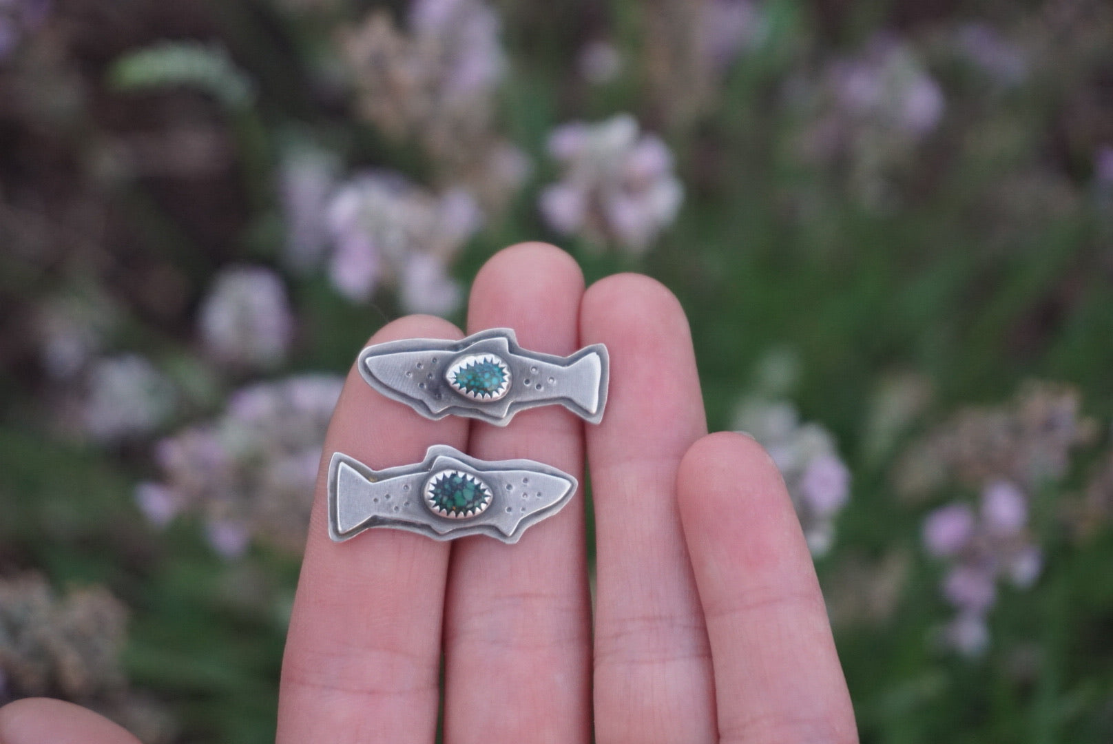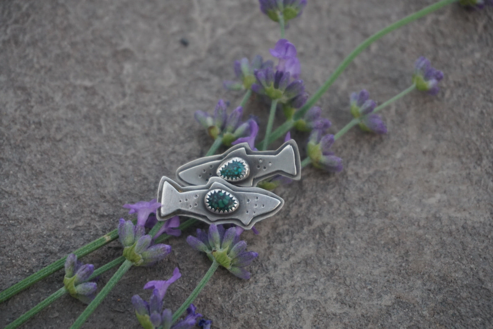 The perfect Trout post earrings. Named after the freestone rivers and the trout that inhabit them, these earrings are hand drawn, sawed and appliquéd with a little webbed turquoise gemstone nestled on top and hand stamped for some fishy texture. These ride the ear like a climber, And are simple but bold all at the same time. Posts are sturdy and comfortable with sterling silver earnuts. Earrings are oxidzed and polished for a soft rustic finish.