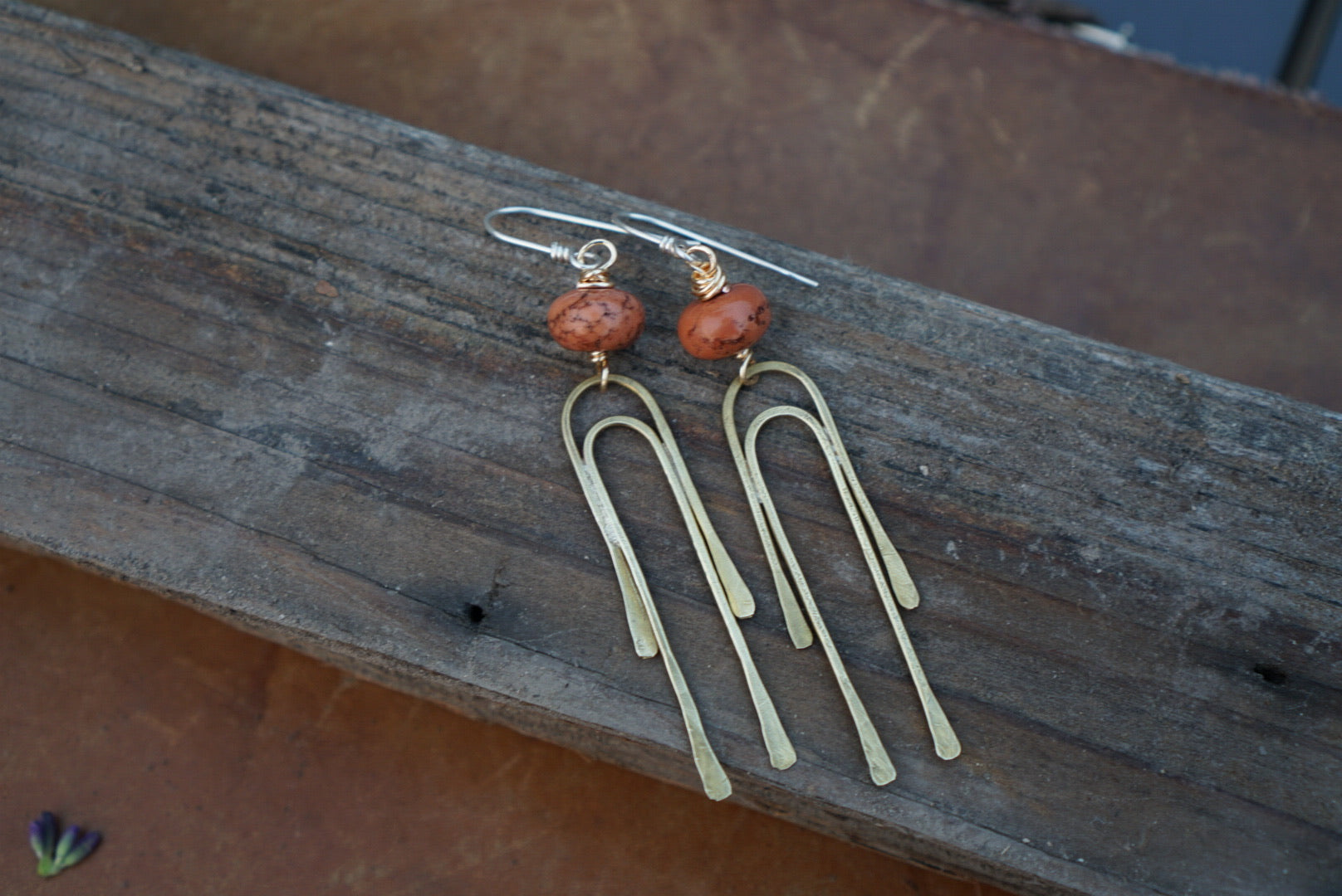 Unique earrings made with hand shaped and hammered brass double wire arches with wire wrapped pink magnesite crowning the top . Finished with handmade sterling silver earwires and measure 3.5 inches long .