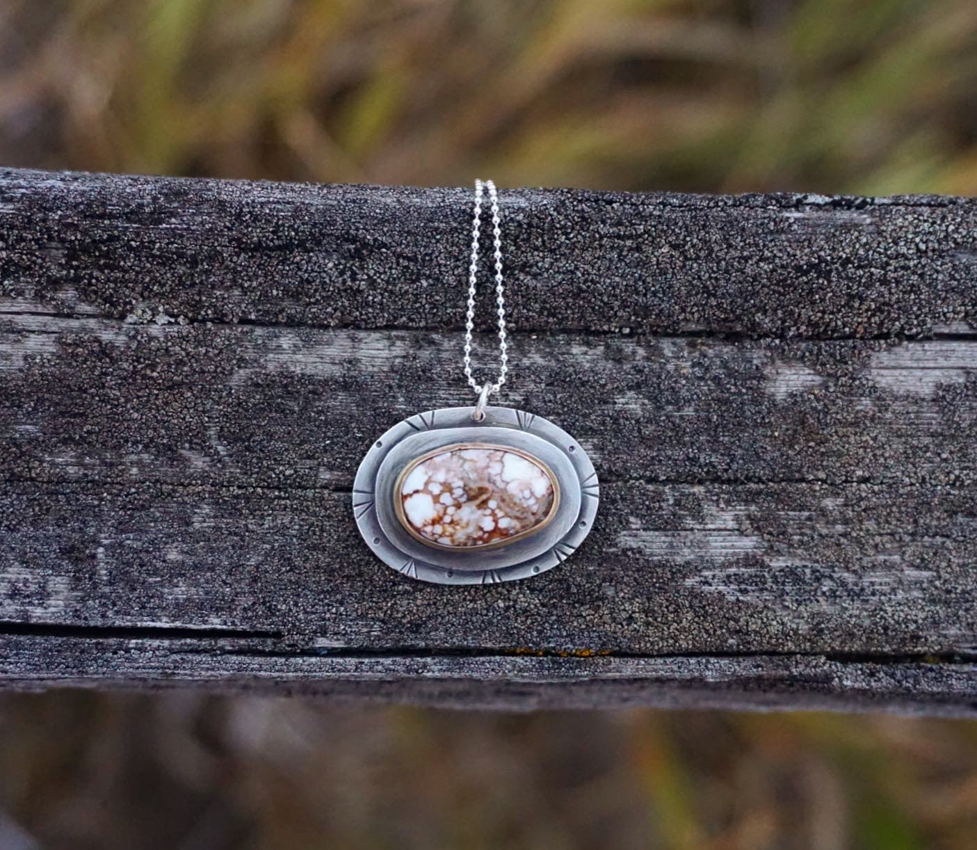 This lovely pendant is made of multiple layers of sterlings silver and a Wild Horse Magnesite stone set in a 14kt goldfill bezel. The bottom layer has hand stamped details and on the back “Crazy Brave” is hand stamped into another layer as a mantra to always remember. This sturdy little pendant hangs from a nice 18 inch sterling silver ball chain.