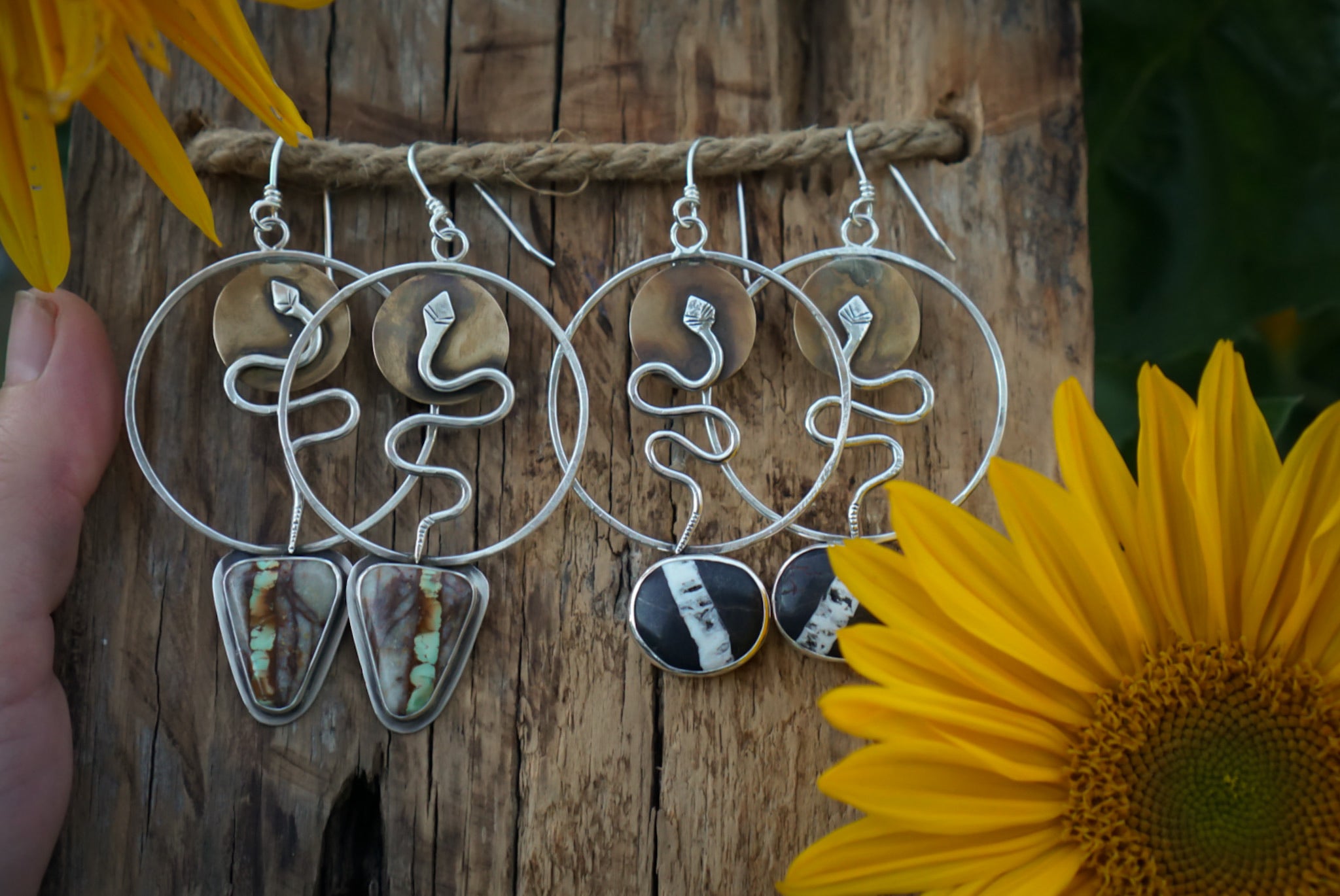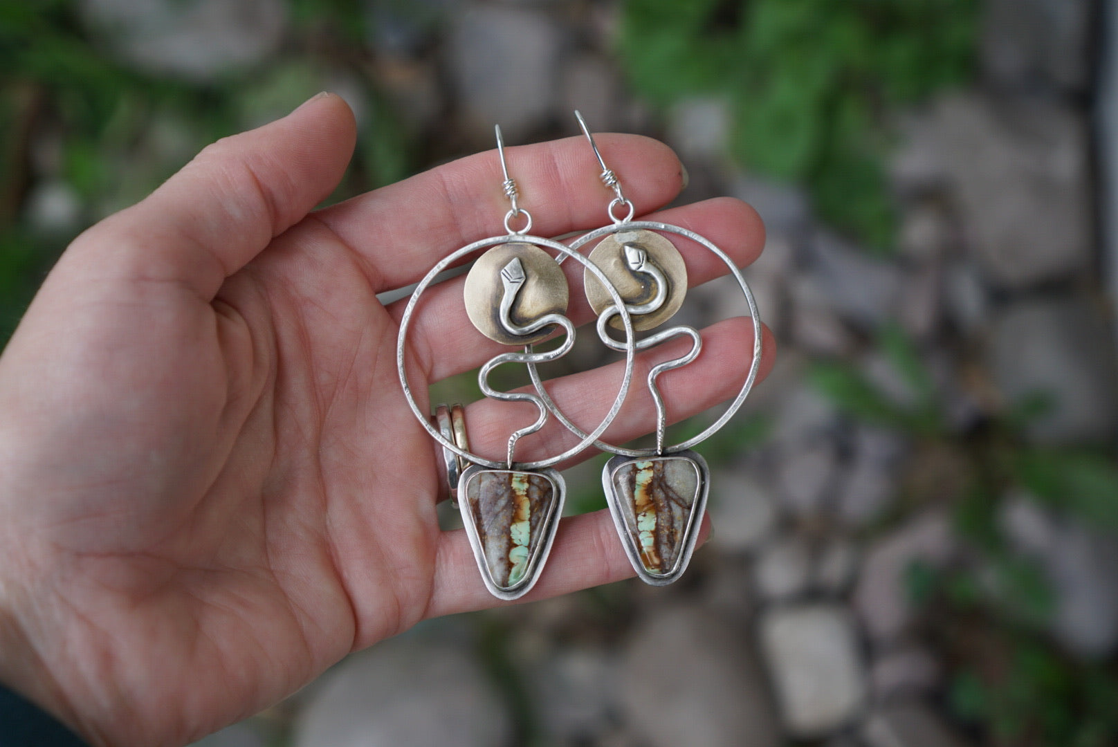 Incredible earrings featuring beautiful slices of light creamy yellowish green and brown matrix Royston Ribbon Turquoise gemstones simply set in sterling silver and nestled below handmade silver hoops with a serpent snake slithering up to a brass moon. Hand stamped details complete the design. Earrings dangle almost 3.5 inches long and are finished with hand crafted Sterling silver earwires. Oxidized and polished for a soft rustic finish. These are sure to WOW!