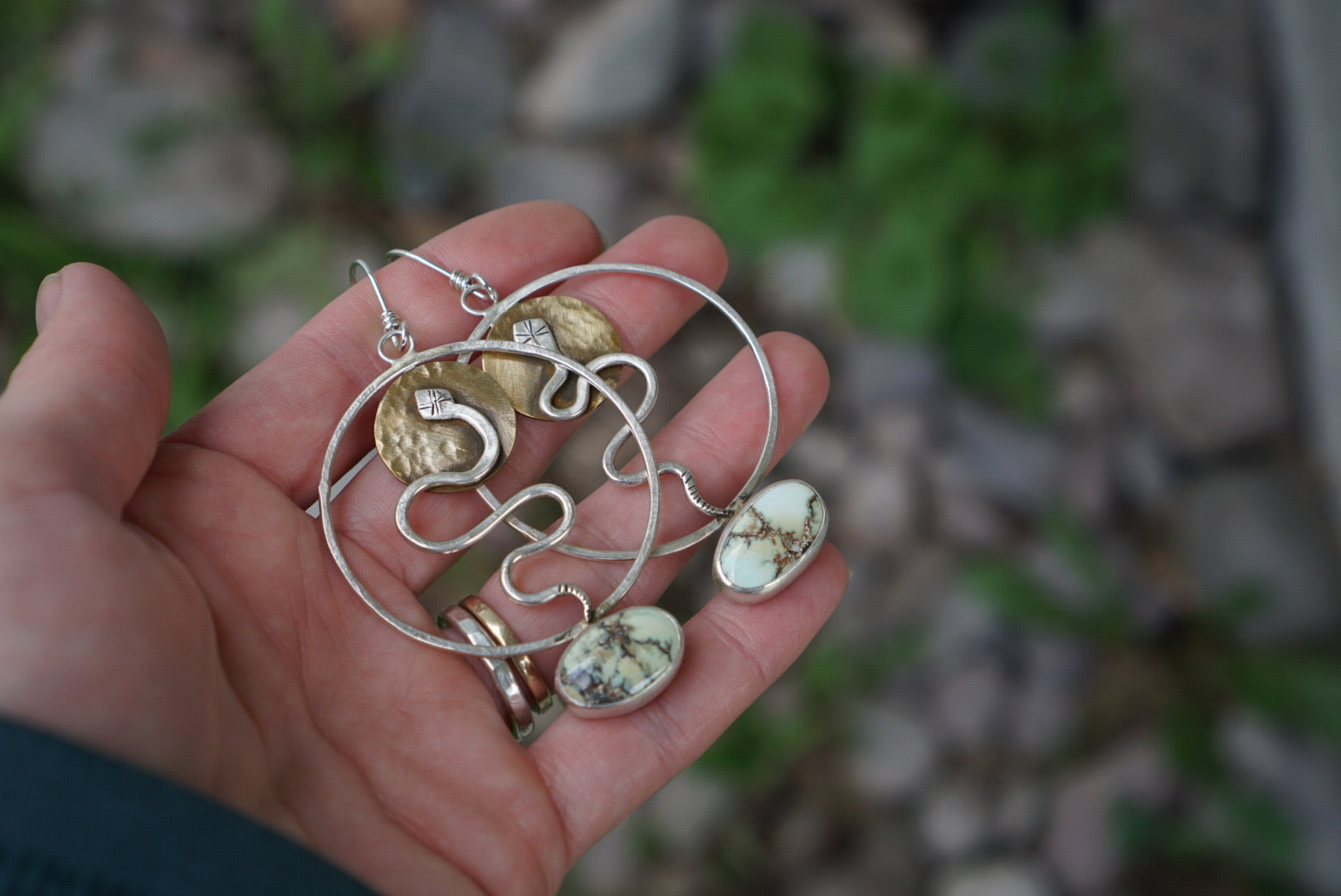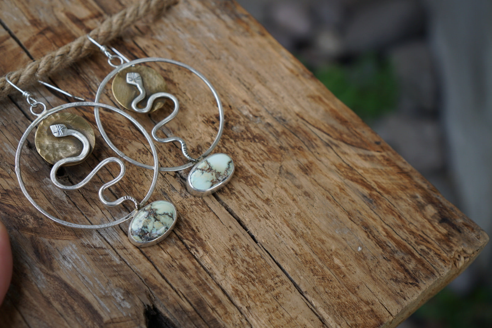Incredible earrings featuring beautiful slices of light creamy yellowish green New Lander gemstones simply set in sterling silver and nestled below handmade silver hoops with a serpent snake slithering up to a brass moon. Hand stamped details complete the design. Earrings dangle just about 3 inches long and are finished with hand crafted Sterling silver earwires. Oxidized and polished for a soft rustic finish. These are sure to WOW!