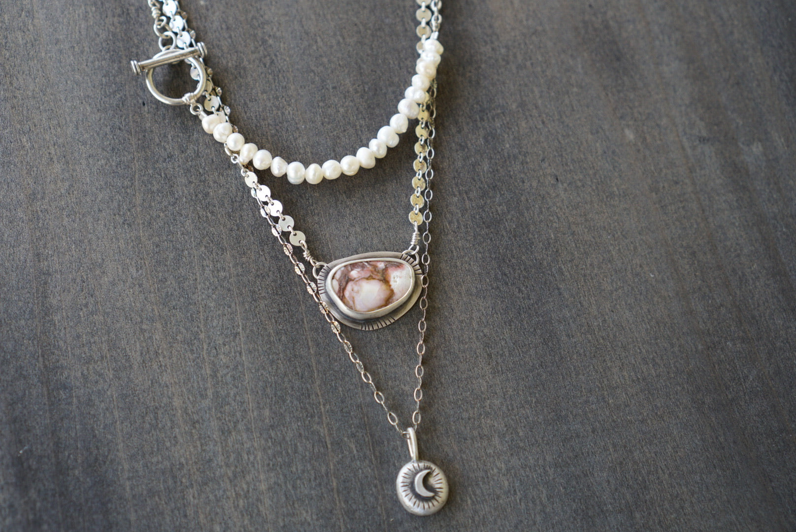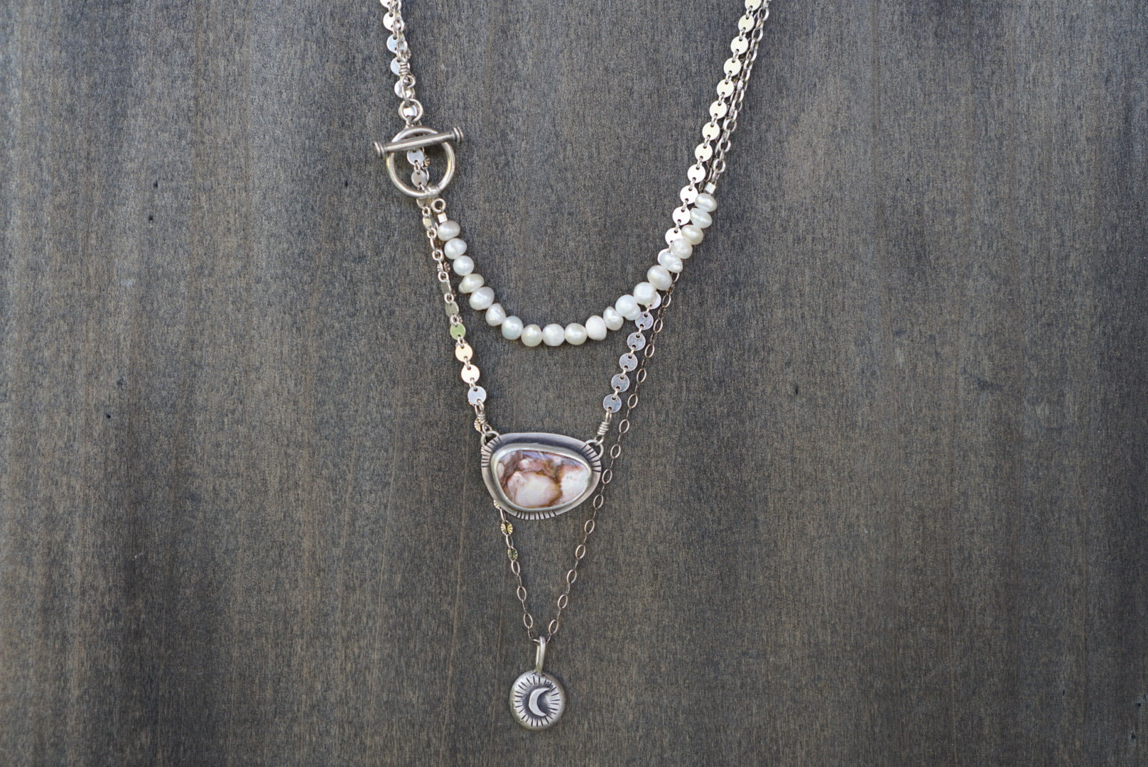 Fun and beautiful necklace set including three necklaces that can be worn layered together or all on their own. This set includes a beautiful 15.5 inch necklace of sterling silver chain and freshwater pearls with a lovely toggle clasp meant to be worn in the front. The second necklace is a Wild Horse Magnesite pendant on a sterling silver coin chain that measures 15 inches with a 2.5 inch extender for adjusting. The third necklace is a reclaimed silver moon pendant on a 20 inch sterling silver chain. Intended to be versatile to wear many different ways and lengths or with other necklaces in your collection!
