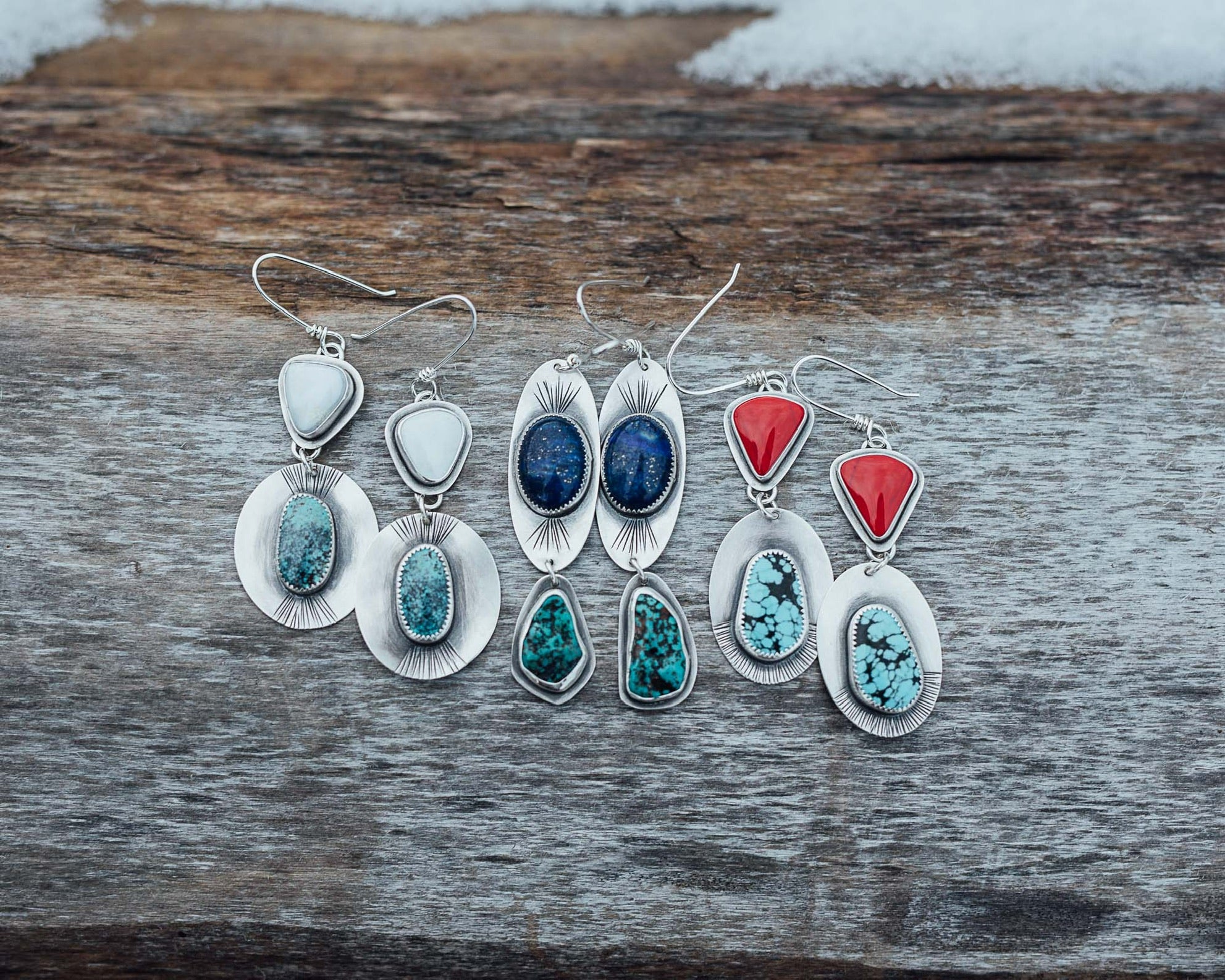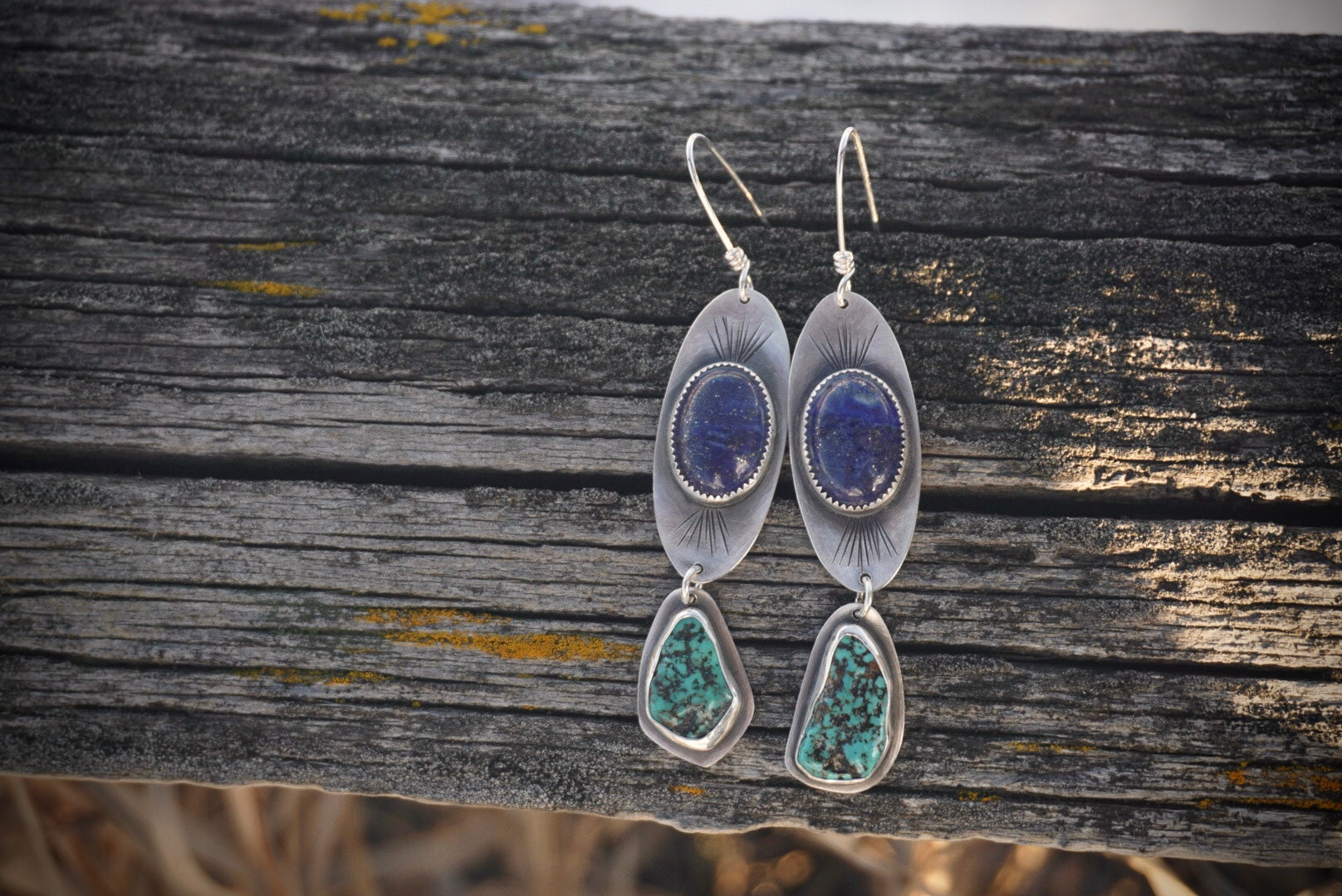 Beautiful earrings featuring amazing dark blue Lapis Lazuli on rustic hand stamped oval back plates and below dangle slices of raw nugget Alacron Turquoise simply set in fine and sterling silver. Lovely contrast and compliment in these stones and surprisingly lightweight for their size. Earrings are finished with hand crafted sterling silver earwires and dangle at about 3.25 inches in length and are oxidized and polished for a soft rustic glow.
