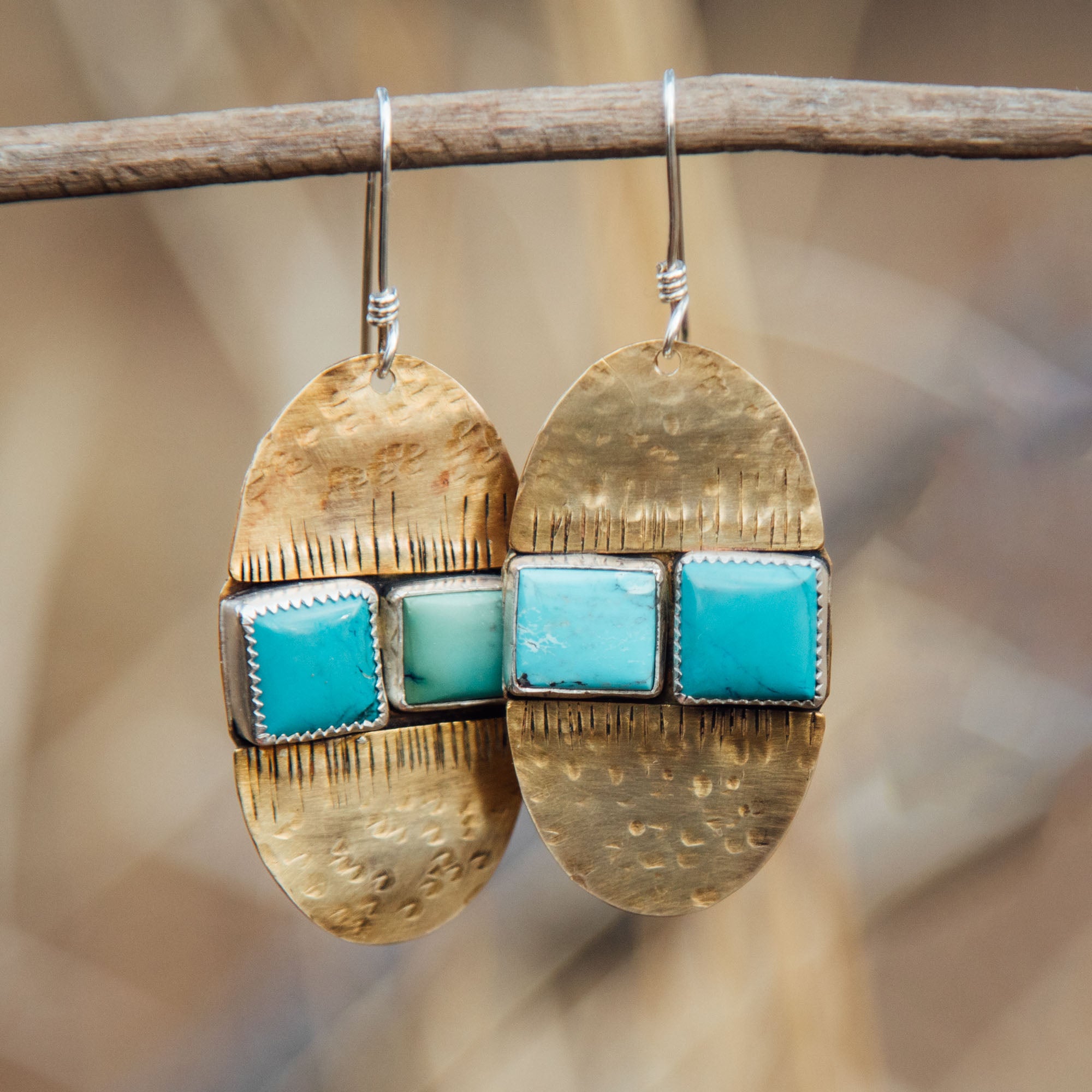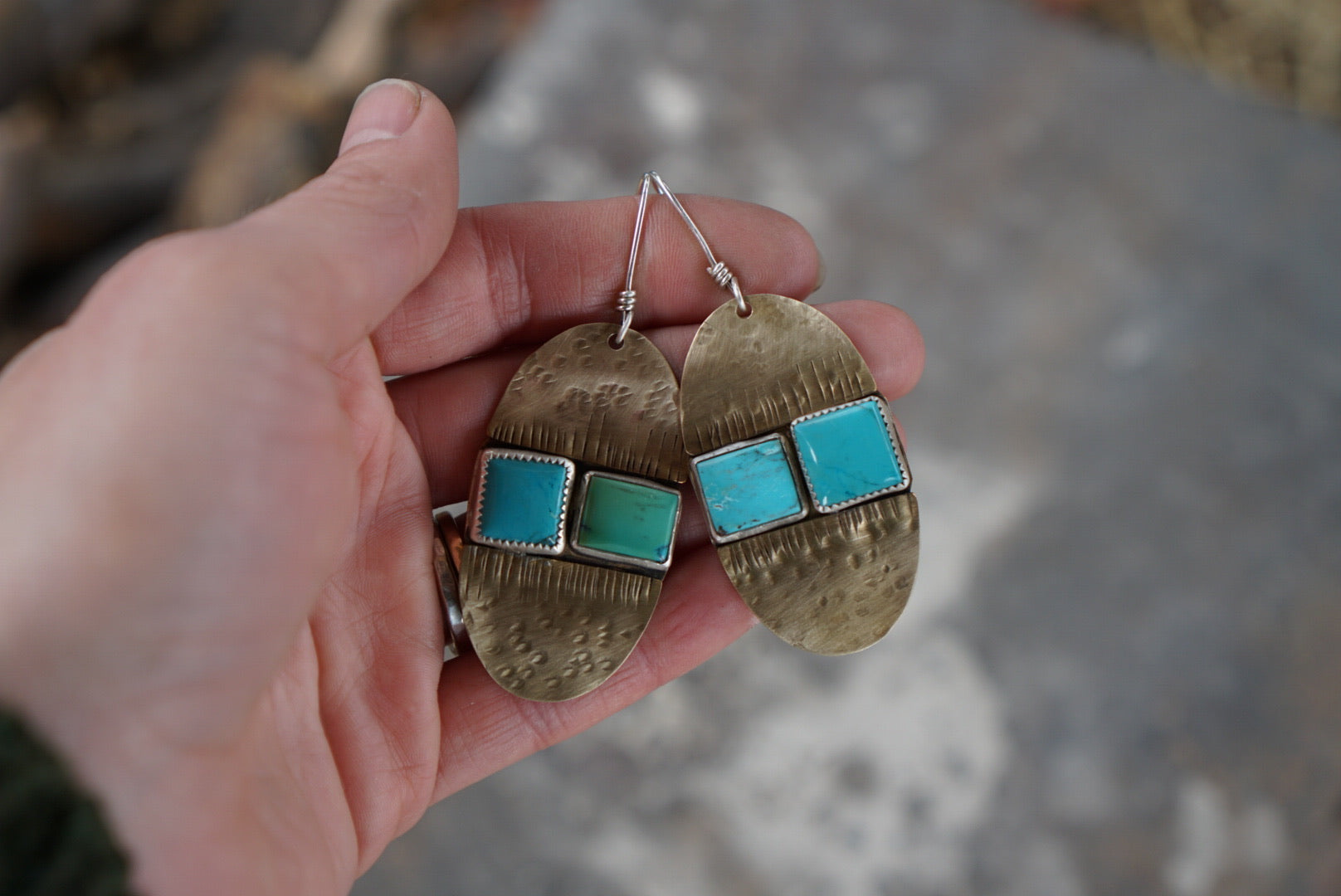 These gorgeous brass earrings feature 4 beautiful sister stone American mined turquoise gemstones set in sterling silver bezels. The gemstones are perched between two half round textured discs that are “quilted” together for a unique look. Finished with Handmade sterling silver earwires and measure just over 2 inches long. These earrings are EXTRA rustic and are not perfect.