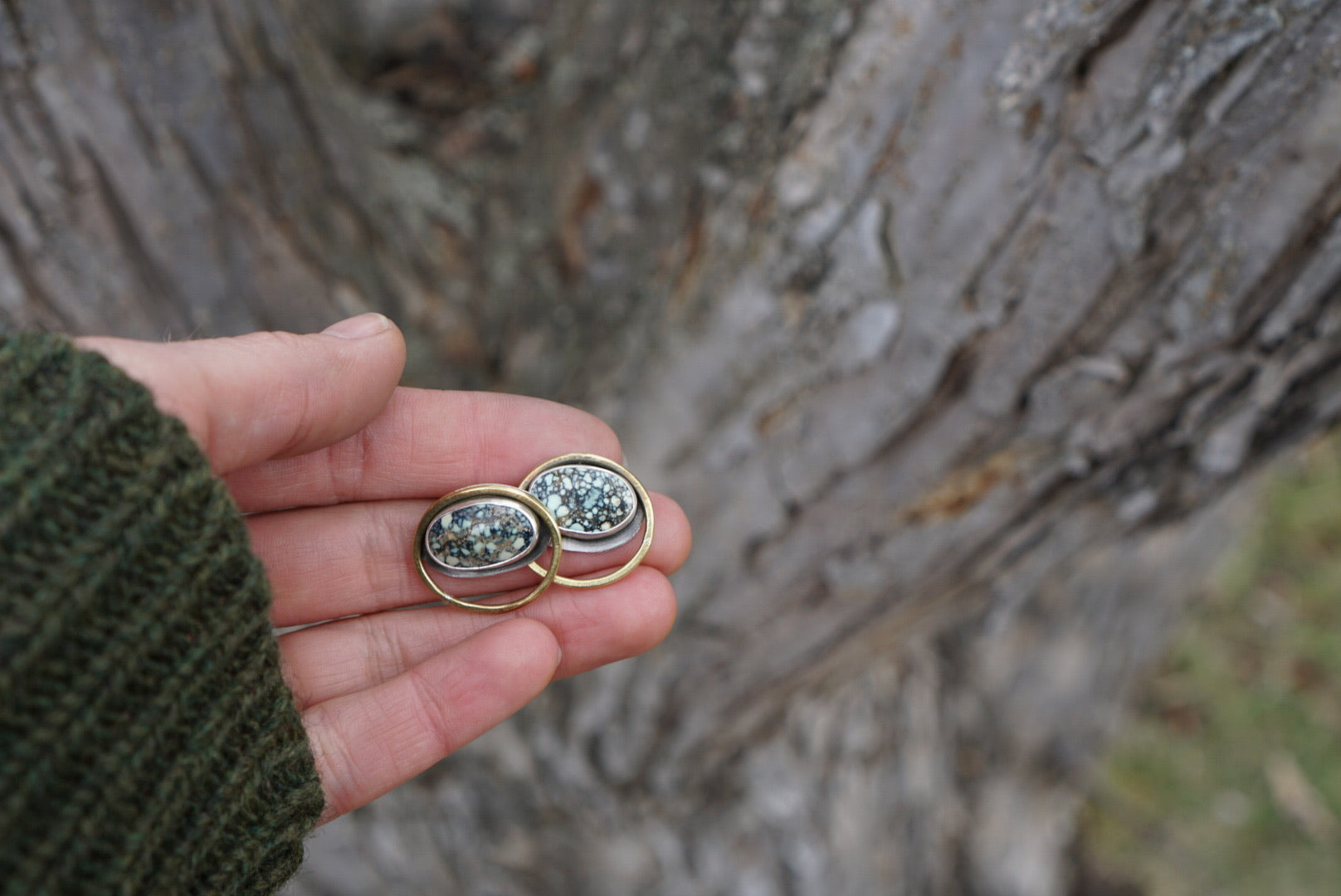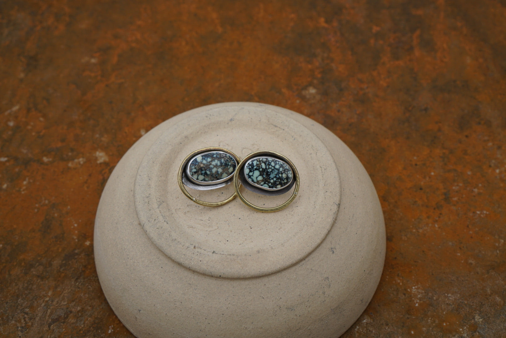 Gorgeous little mixed metal posts perfect and comfortable for the everyday. Made with fantastic pieces of New Lander Variscite that are simply set in sterling silver with hand formed and hammered brass hoops looped around the edge like a ring around Saturn. Simple enough to wear with everything, but interesting enough to make a statement.