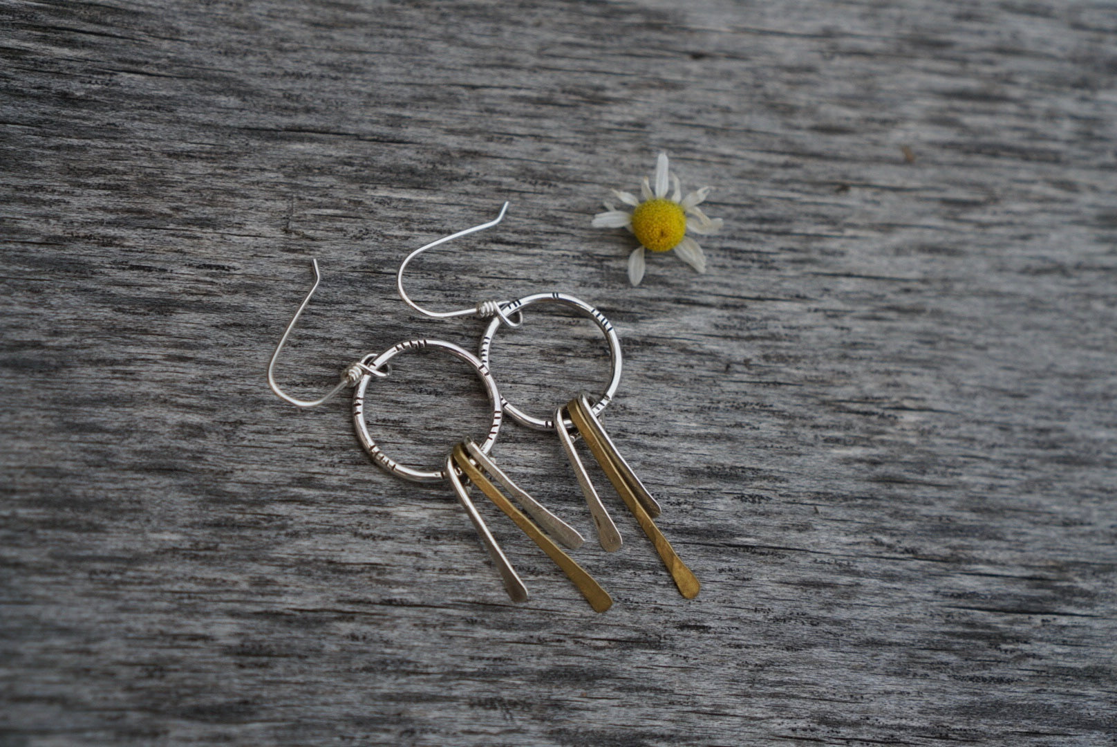 Simple hand shaped and stamped sterling silver circles with mixed metal fringe at the bottom. Simple and fun. Finished with sterling silver earwires. Measure 2.5 inches long.