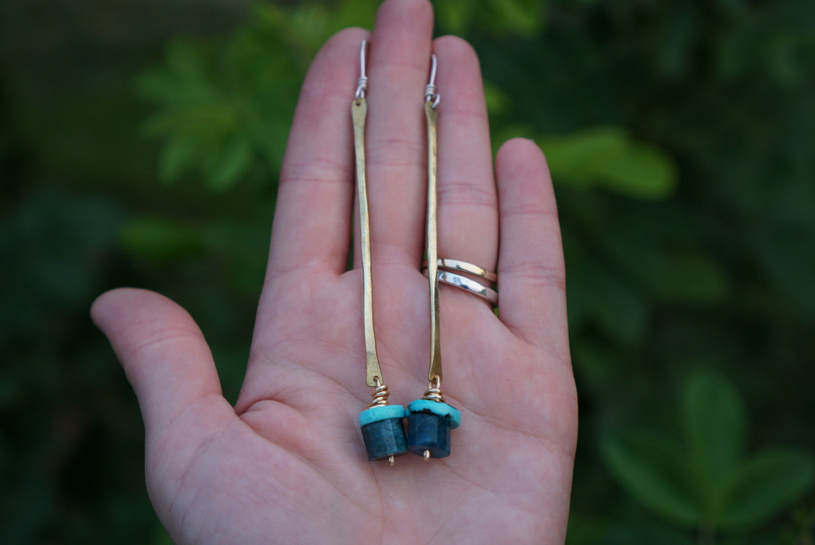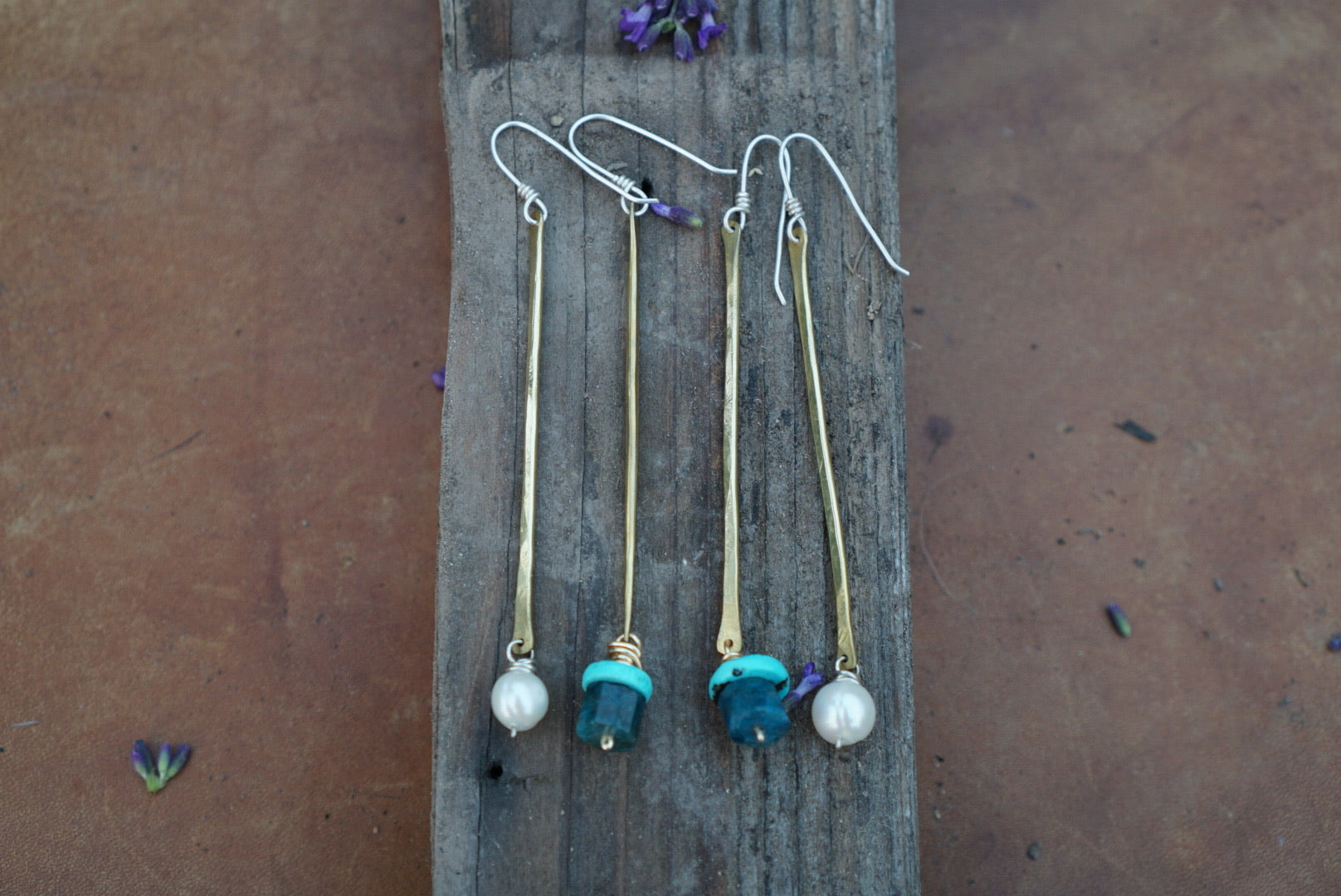 Perfectly plain but elegant earrings made from hand hammered brass sticks with white freshwater pearls dangling at the bottom. Finished with handmade sterling silver earwires. Measure about 3.75 inches long.