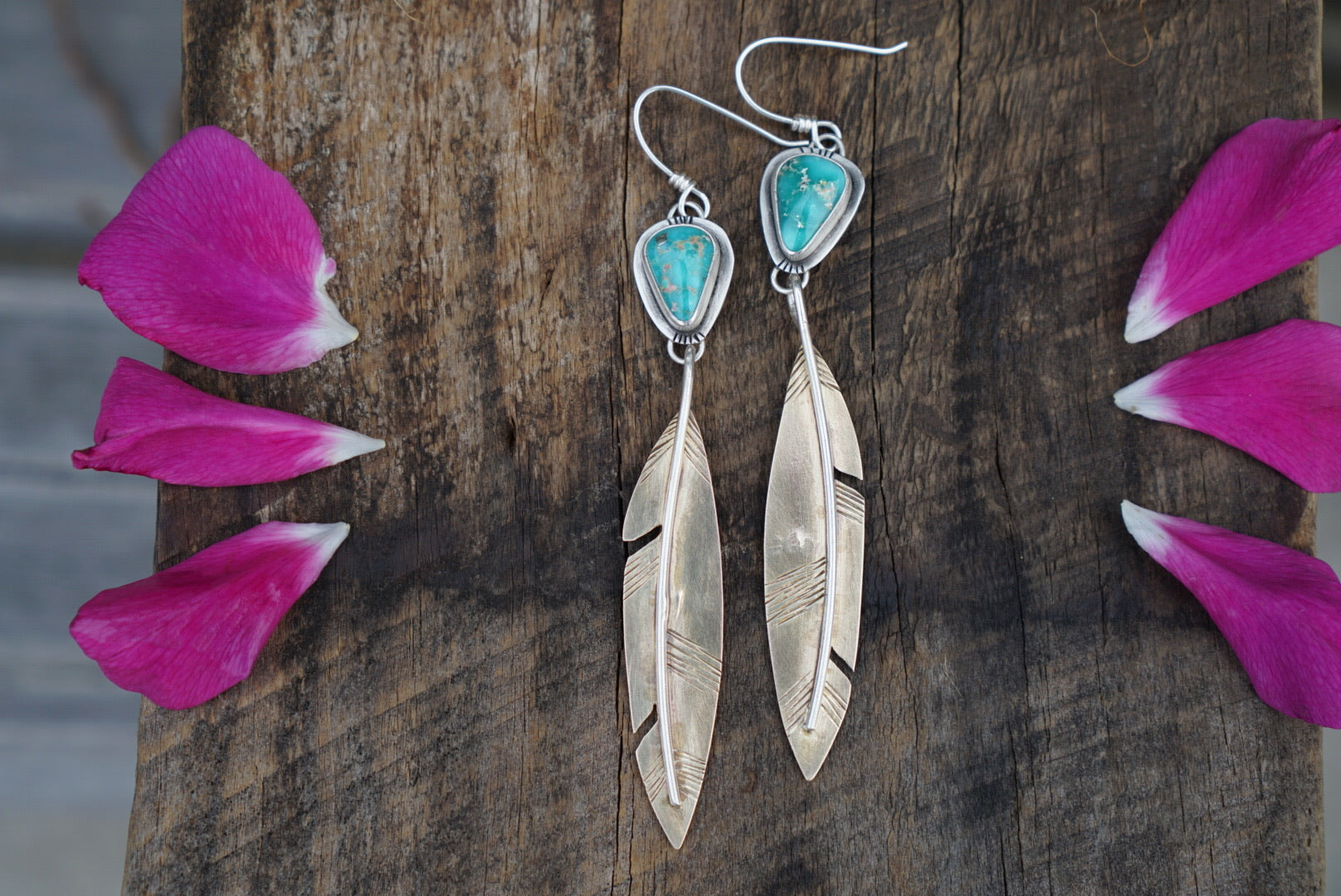 Gorgeous feather earrings made with hand drawn, sawed and textured brass feathers dangling below turquoise gemstones simply set in recycled sterling silver with hand stamped details. Finished with handmade sterling silver earwires. Earrings dangle about 4 inches from the top of the earwire to the base of the stone.