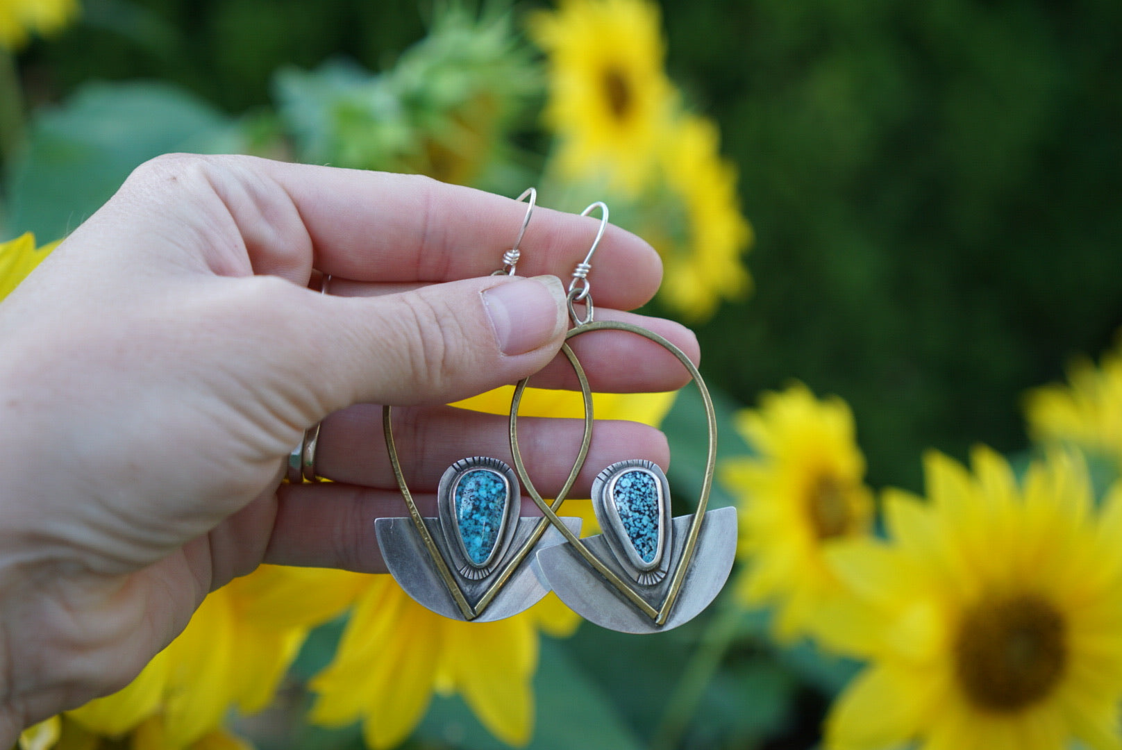 This fun design features Kingman turquoise nestled in sterling silver and perched atop sterling silver half moons looped with petal shaped hoops. A great combo of metals and a little Western flare. Finished with handmade sterling silver earwires. Earrings dangle about 3 inches from the top of the earwire to the base of the stone.