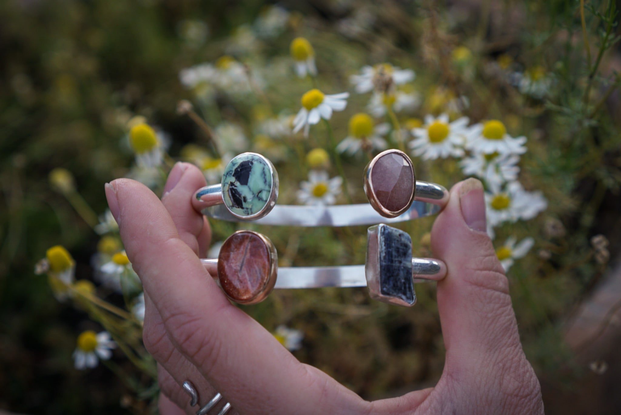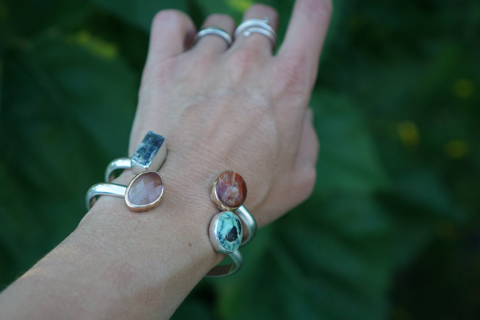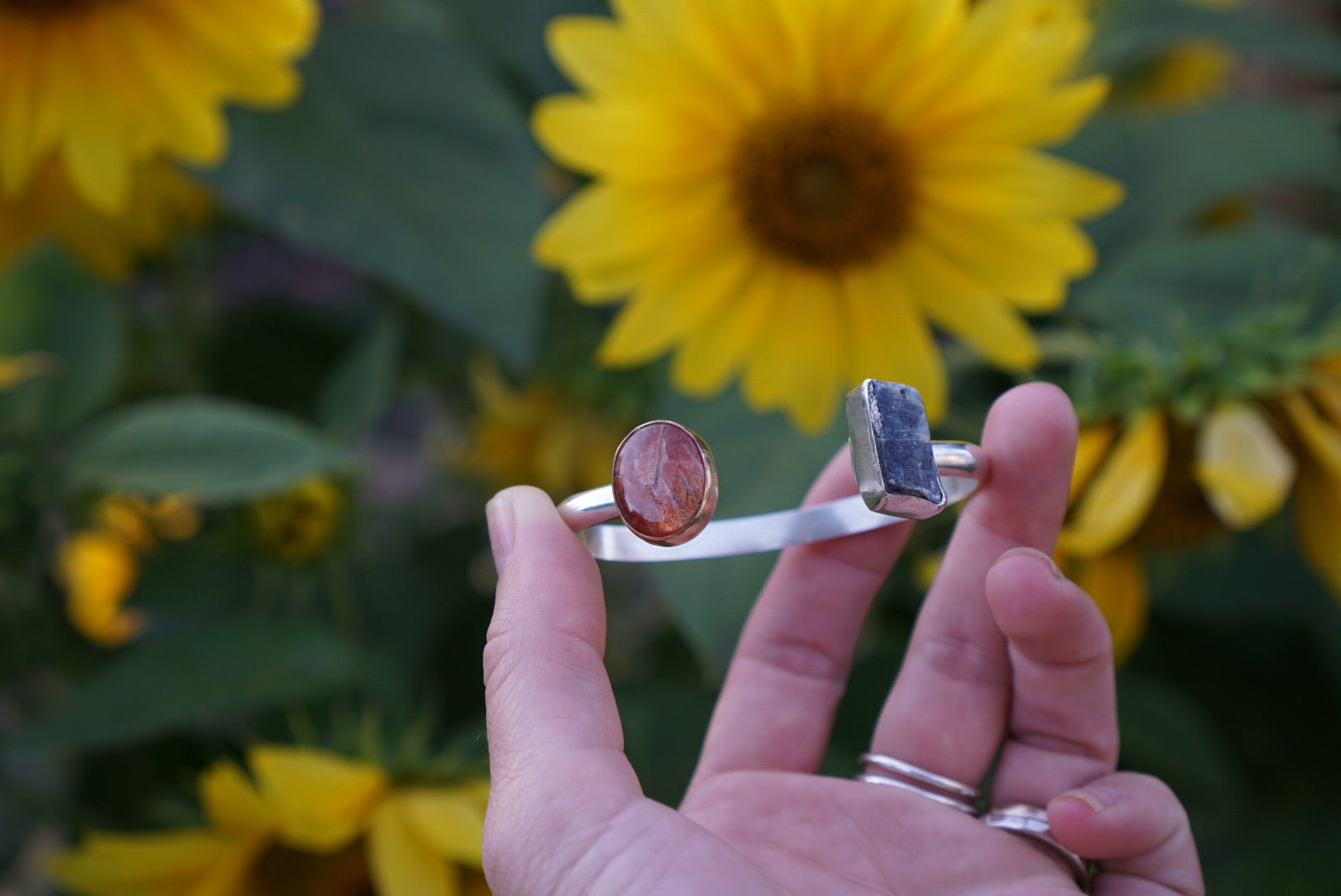 Stunning cuff constructed with extra thick and sturdy half round wire with two beautiful stone on either side. One stone is a raw rustic hunk of deep silvery and blue kyanite nugget with extra rustic silver bezel setting and the other is a shimmering slice of natural orange Sunstone in a 14kt goldfill bezel. Gorgeous contrast and compliment. Bracelet measures 5.5 inches in length with a 1-1.5 inch opening. Cuff can be squeezed closed or pulled open for semi-adjustable fit. One size fits most.