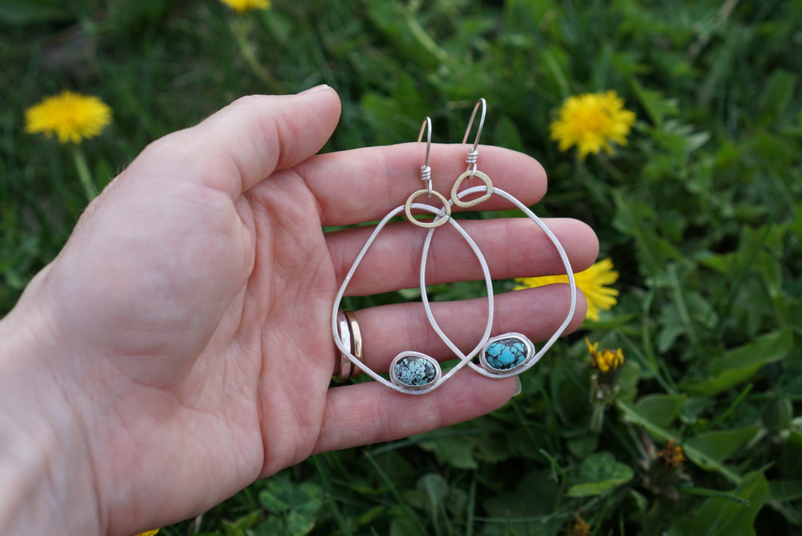 The extra organic shapes of these hoops, settings and brass details remind me of the rocks in the river bottoms. Organic sterling silver hoops with organic shaped brass loops details and simply set turquoise in organic shaped hand cut settings nestled at the bottom. Finished with handmade sterling silver earwires. These hoops measure about 2.75 inches in length. The absolute perfect earthy hoop earrings for everyday.