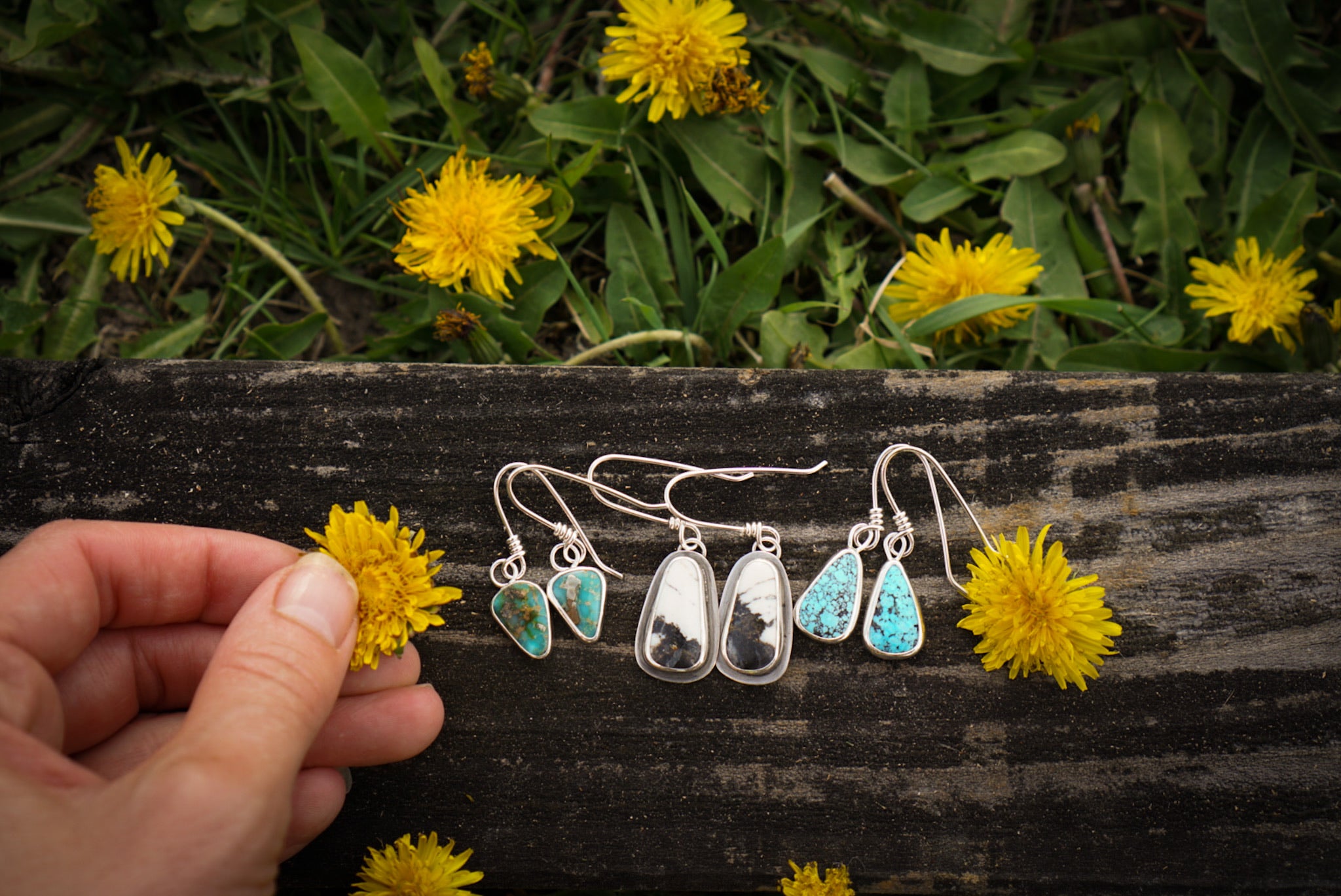 It’s the little things that matter. And, the gorgeous White Buffalo of these little dangle earrings will definitely have you feeling that way. Beautiful black and white White Buffalo stones are simply set in fine and sterling silver and dangle from hand crafted sterling silver earwires. Earrings measure just about 1.75 inch in length from the top of the earwires the tip of the stone. The absolute perfect earrings for everyday.
