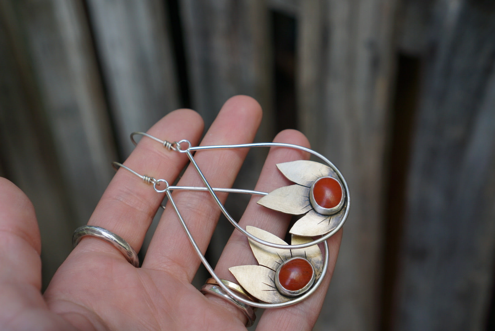 Incredible earrings featuring beautiful slices of Red Jasper simply set in sterling silver and nestled along handmade petal shaped hoops and hand sawed brass tulip designs. Earrings dangle about 3 inches long and are finished with hand crafted Sterling silver earwires. Oxidized and polished for a soft rustic finish. These are sure to WOW!
